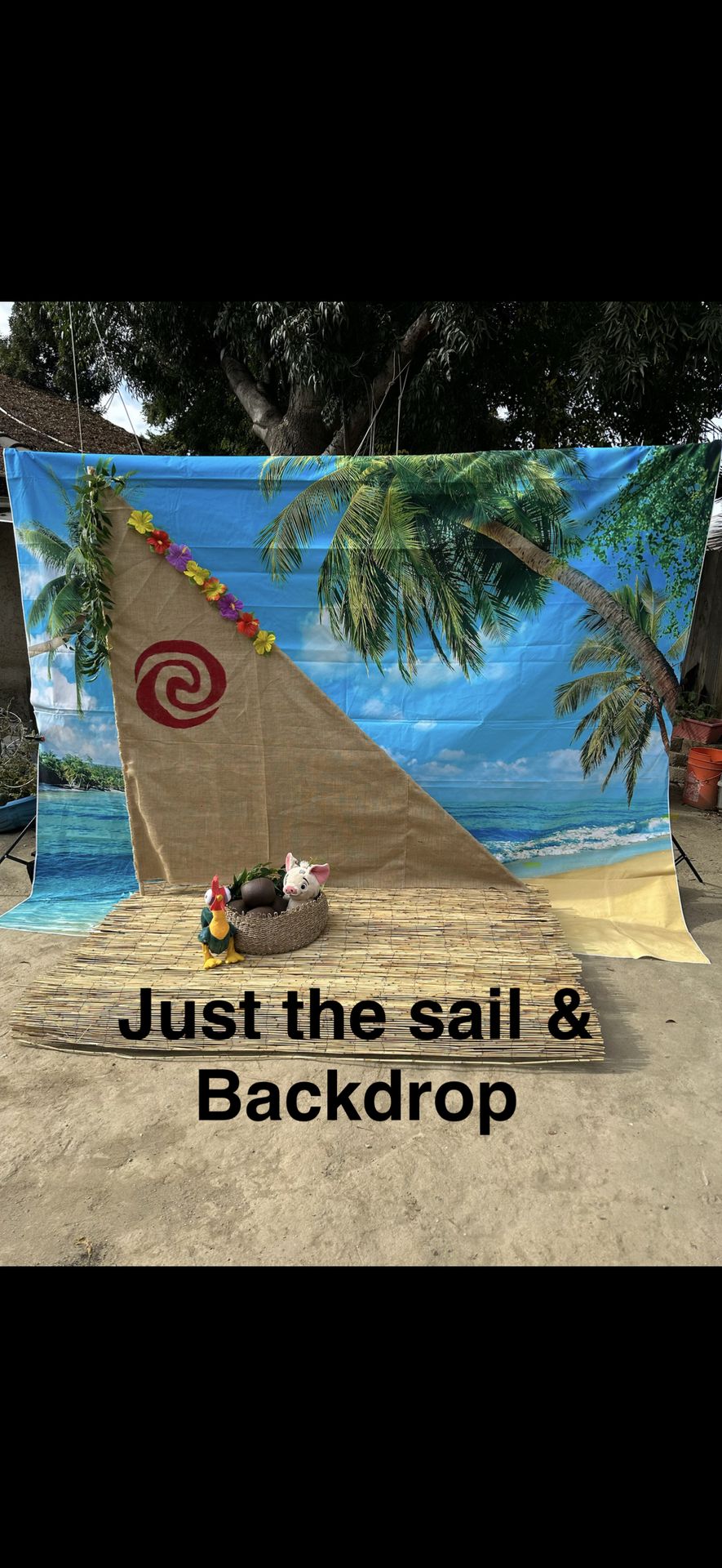 ALL FOR $180 Two beach backdrops $20 Moana cardboard cutout $20 10 palm trees $40 4 centerpieces $40 Coconuts $10 Tapestries $30 Burlap Table cloth $25 Number & misc greenery $10 Sail $20 Wood swirl $5