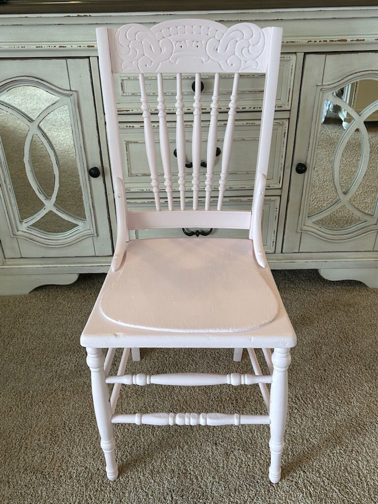 Antique chalk painted chair in a sweet soft pink. Very sturdy.