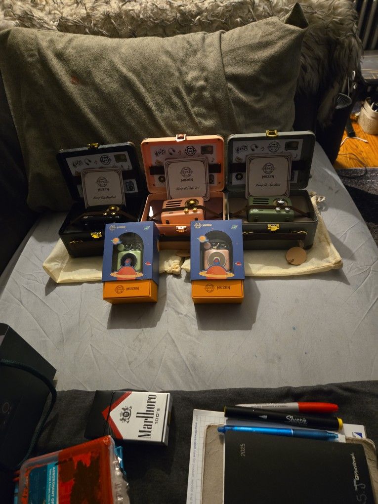 Portable mini Wireless AM/FM radios, with Bluetooth as well as Auxiliary options available. Comes with an attachable Antenna, along with the charging cord and type-C to Aux adapter. Heavy, made of metal. Great quality material. All packed up nice and neat in its very own adorable Mini-suitcase, along with a fabric pull string bag for optional transport, or just as a great way to deliver this, one-of-a-kind Raido as a gift. Comes with a cute gift bag as well. There are two different types of These Radio's available, 1. Muzen Button Portable FM Speaker 2. Muzen OTR Metal Portable FM Speaker We've got three different color options available to choose from. 1. BLACK 2. GREEN 3. PINK Limited supply of all three color variations for both types of product.