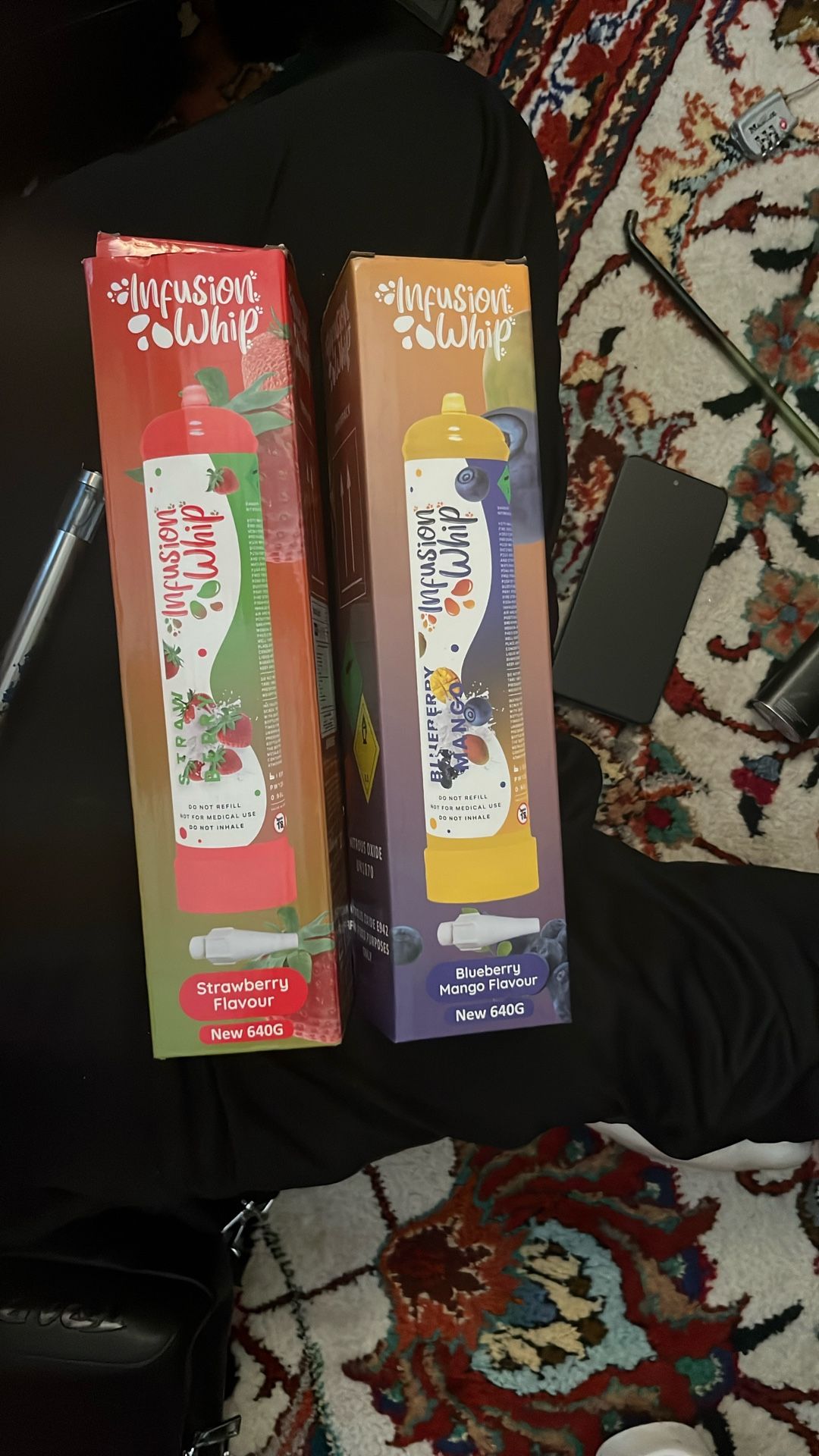 Infusion, whip, strawberry and blueberry mango flavors New 640 G nitrous oxide unit 1070 makes tasty whip cream 100 F or both