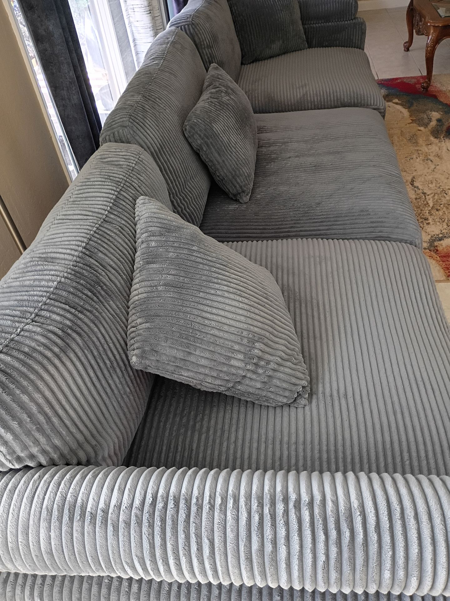 3 piece sectional couch (2 corner pieces and 1 middle)with three huge back cushions and 5 pillows. This couch comes apart easily and can be put together in an L shape or just made smaller. There are multiple ways to arrange it. There are back rest pieces on each section that can also be removed easily. The pegs for the bottom of each section are screwed in and can be removed as well making it easy to move into small doorways.
