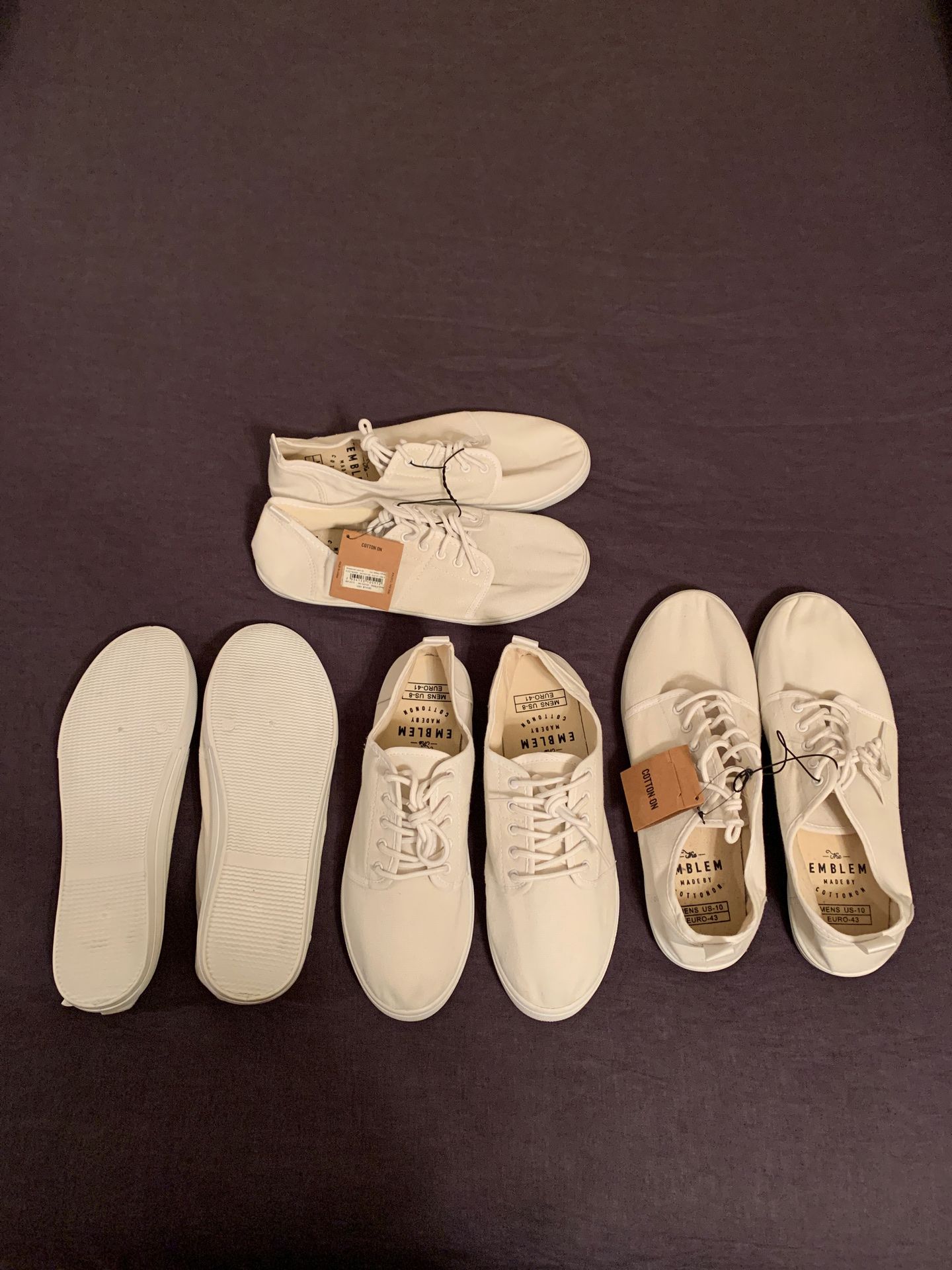 New, some still have tags, multiple pairs of plain white-canvas sneakers from Cotton-On. Retail price $15 each. Despite men’s size, can definitely be unisex! Sizes in Men’s available: 8-2 pairs 9-1 pair 10-2 pairs 11-2 pairs