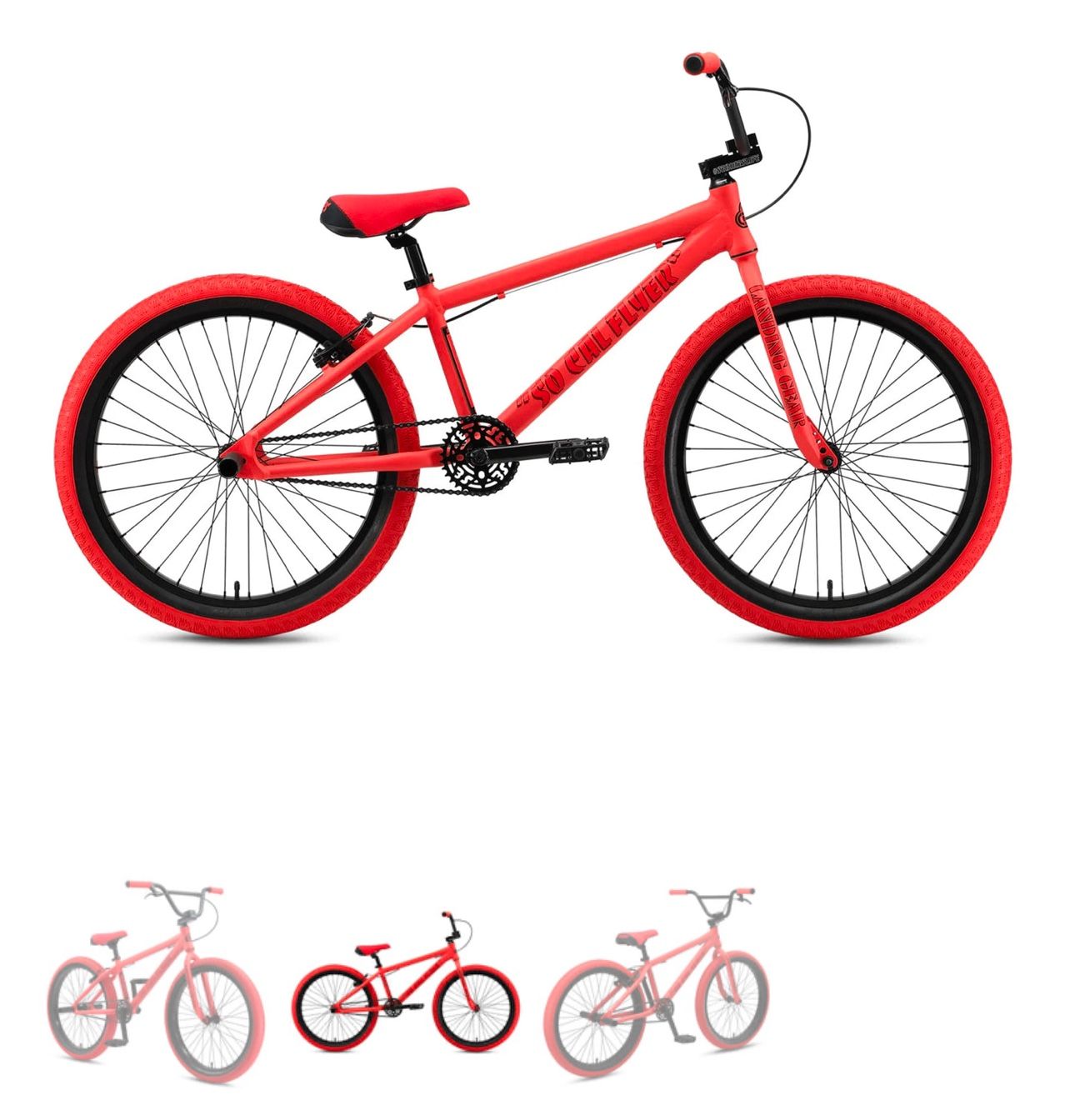 SE Bikes So Cal Flyer 24" Matte Red $648.88 The 24" So Cal Flyer is back with a vengeance this year. The frame has been beefed up with an internal headset, sealed bearing mid-bottom bracket and wider stays. The bike spec has been upgraded with the new 24" x 2.4" Bozack tires, double-wall rims and SE nylon fiber pedals. The So Cal Flyer is THE bike to have if you're looking for a 24" BMX bike. Now you just have to decide on which of the four awesome new colorways to choose from. Key Features * Lightweight 6061 aluminum floval tubing frame with internal headset, mid bottom bracket and SE Wave dropouts * Double-wall rims with alloy hubs * New SE Bozack 24” x 2.4” Tires * Flyer seat with super grippy top cover * SE Bikes Life grips with rubber end plugs * Retro top-load stem with hidden top cap for a clean look * 3-piece tubular cranks with custom SE Racing sprocket * SE nylon fiber pedals * SE Wheelie pegs and alloy valve caps included * 28.3 pounds SPECIFICATIONS COLOR(S) Black, Orange, Yellow Camo, Stealth Mode Black FRAME 6061 Aluminum Floval Tubing, Internal Head Tube, 68mm Wide Mid Bottom Bracket, Wide Rear Stays, SE Wave Dropouts FORK Landing Gear CRANKSET SE 3-pc Cr-Mo, 180mm, Sealed Bearing Mid Bottom Bracket, 150mm Spindle Length, 19mm Spindle Diameter, 32T SE Sprocket PEDALS SE Nylon Fiber Platform CHAIN KMC S1 WHEELSET SE Racing Alloy 36H Flip-Flop Hubs w/ Double-wall Rims, 14T Freewheel TIRES SE Bozack, Street Proven Multi Purpose Compound, Wrap Around Urban Tread Pattern, Grooved SE Wing Logo, 24" x 2.4" Front & Rear BRAKESET Promax V-Brake BRAKE LEVERS Promax 2-Finger Alloy HEADSET FSA No.10, 1-1/8" Internal HANDLEBAR Big Honkinish Cruiser Bar, 28.5" x 6.5", 10° Backsweep, 1° Upsweep STEM SE BIKELIFE Alloy Top-Load, 55mm Reach GRIPS SE BIKELIFE Grips w/ SE Rubber End Plugs SEAT SE So Cal Flyer Seat w/ Super Grippy Top Cover SEATPOST Race Rocker Micro-Adjust Alloy, 27.2mm SEAT CLAMP Alloy, 31.8mm Inner Diameter ACCESSORIES SE BIKELIFE Wheelie Pegs, Alloy Valve Caps WEIGHT 28.3 lbs / 12.83 kgs EOMETRY A TOP TUBE, ACTUAL 21.3" B SEAT TUBE, CENTER TO TOP 12.5" C SEAT TUBE ANGLE 72° D HEAD TUBE ANGLE 73.5° E CHAINSTAY LENGTH 16.25" F WHEELBASE 39.5" G BOTTOM BRACKET HEIGHT 12.4" H STANDOVER 26.4" SUGGESTED RIDER SIZE 5'3"+ (160cm+) STEM 55mm HANDLEBAR WIDTH 28" CRANK 180mm WHEEL SIZE 24" SEAT POST DIAMETER 27.2mm * * Categories: Best Sellers, Big Wheel BMX Bikes, Bike Life, Bikes, Bmx Bikes, BMX Bikes, BMX Bikes 27.5 Inch,Featured Products, Free Ship, Latest Products Tags: 27.5, Perry Kramer PK Ripper 27.5", Raised up, Se bike, Se bikes, se bikes near me * * Categories: Best Sellers, Big Wheel BMX Bikes, Bikes, Bmx Bikes, BMX Bikes, Bmx Bikes 29 Inch, Featured Products, Free Ship, Latest Products, Se Bikes * Tags: 29 in, 29 inch, 29", SE Bikes, SE Bikes Big Ripper 29 ", SE Bikes Big Ripper 29 Near me, SE Bikes Big Ripper 29" Ball Burnish Silver, SE Bikes Big Ripper 29" Purple Rain, SE Bikes Big Ripper 29" Red Anodized, SE Bikes Big Ripper 29" Yellow Sparkle