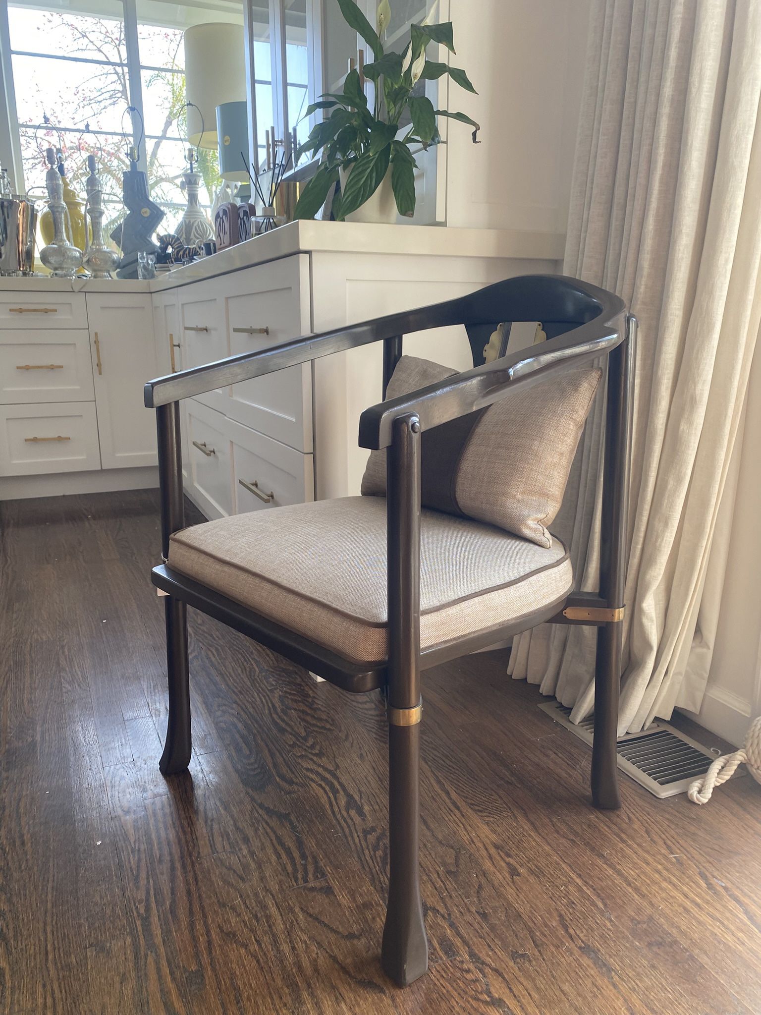 painted brown with gold ornamentation , Newly upholstered. dec pillow comes with the chair. 2 chairs ($350 each ) demensions: - 25.5" W x 23"D - Arm height: 25.5 in - Seat height: 16.5