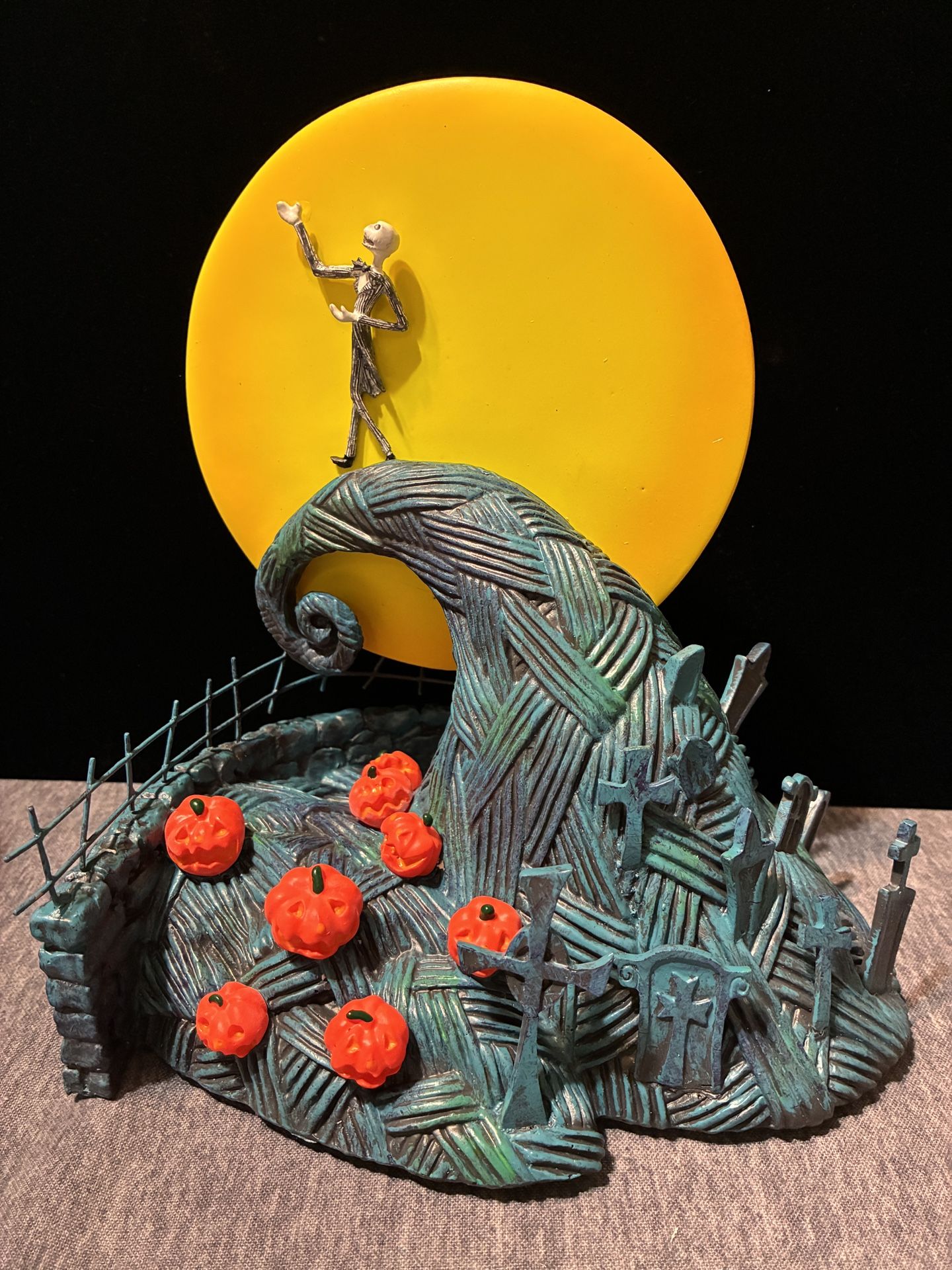 This is a used figurine that is designed for black light exposure. It does have damage. One of the crosses in the graveyard is broken off. It is possible to fix it with glue if you want, but it can also be left off. A good amount of the graveyard items have cracks in them, but when displayed it is hardly noticeable. Most are reinforced with a wire so they aren’t breaking off. This item normally sells for over $50 on eBay in good condition.