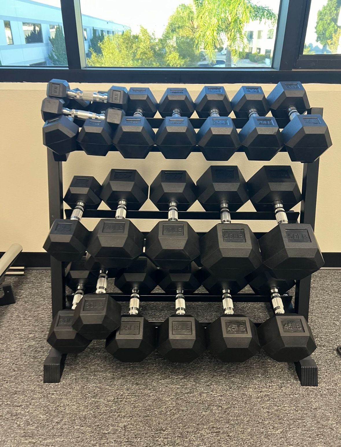 Our products include All-In-One Gym, Squat Bench Rack, Cable & Smith machines, Adjustable Dumbbells, Benches, Olympic Bar Barbell, Bumper Plates, Weights, Home Fitness Exercise Equipment, Attachments ‼️Set up an appointment to visit our showroom and see all of our products on display‼️ Includes 5-50lb rubber hex dumbbells in 5lb increments with 3 tier dumbbell rack Includes 2 x 50lb dumbbells 2 x 45lb dumbbells 2 x 40lb dumbbells 2 x 35lb dumbbells 2 x 30lb dumbbells 2 x 25lb dumbbells 2 x 20lb dumbbells 2 x 15lb dumbbells 2 x 10lb dumbbells 2 x 5lb dumbbells 3 tier dumbbell rack Also selling more gym equipment on my profile. Message me for bundle deals!