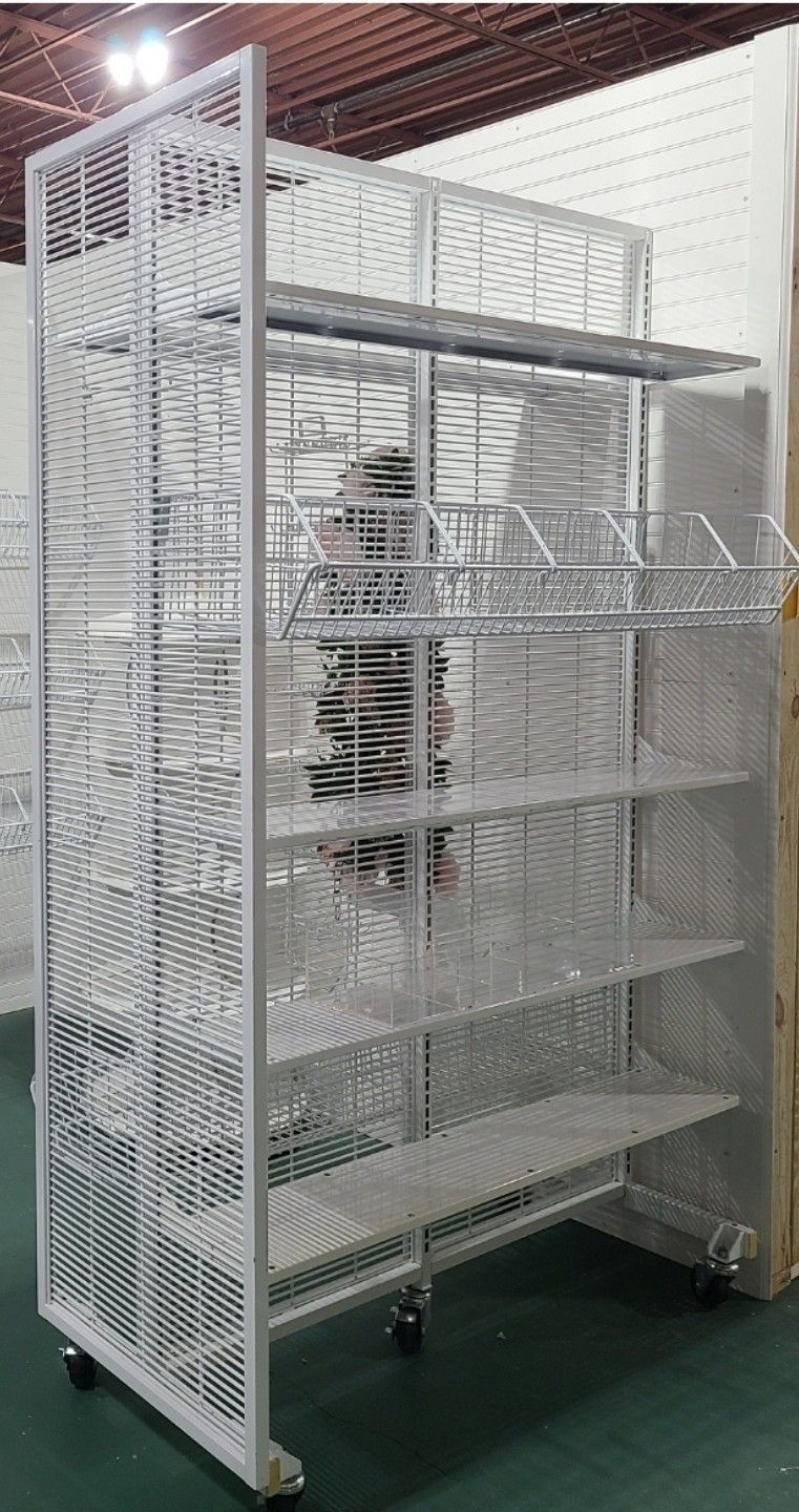 Joann's Metal Rolling Displays I have x2 available. Only one is pictured. Currently attachments are removed. They each come with metal shelves and wire basket attachments. (Hanging floral and acrylic display not included.) Asking $500 for both or $265 each.