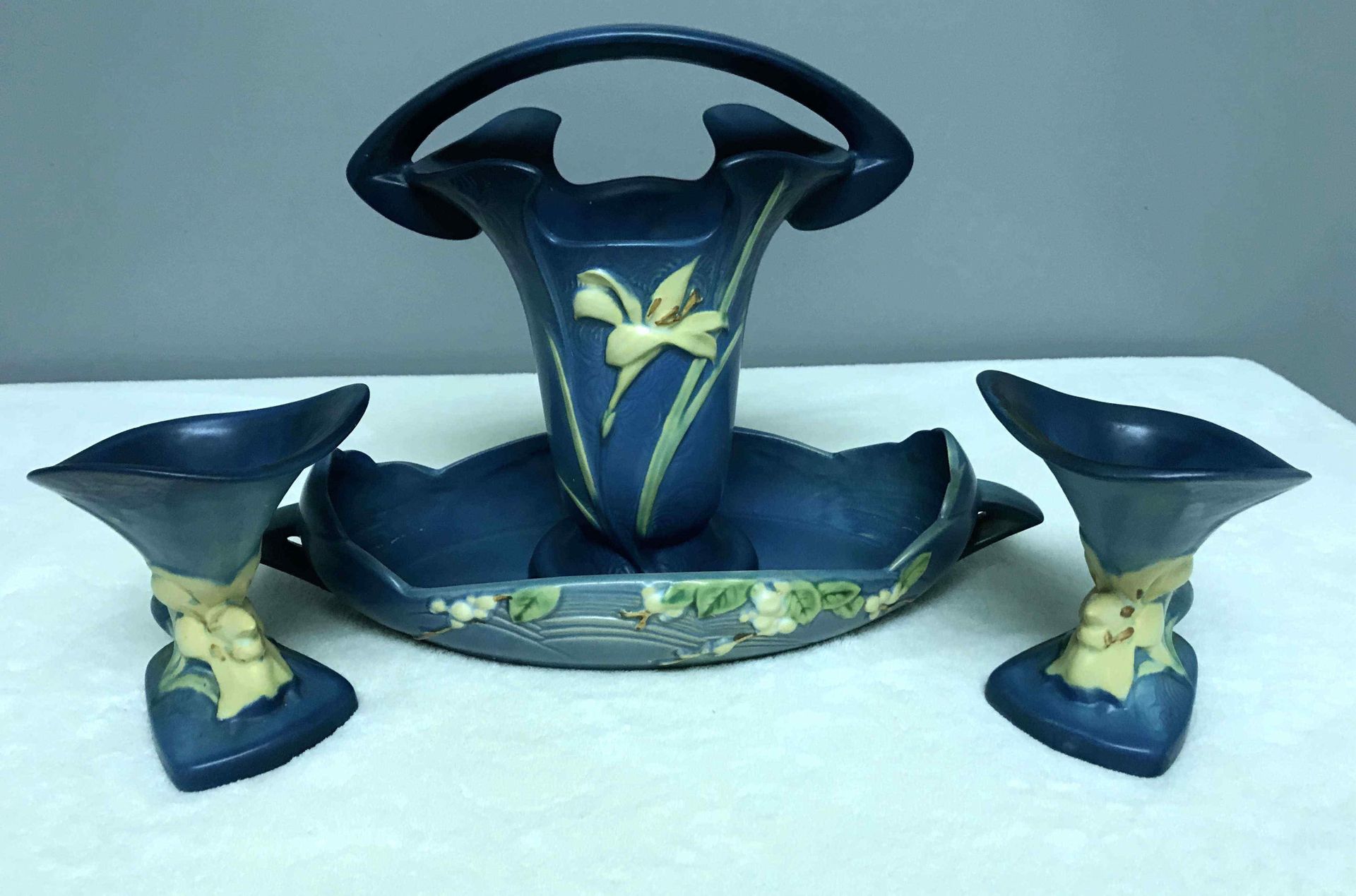 Roseville Art Pottery Zephyr Lilly Bermuda Blue - 4 Piece Set Console Bowl / Tray, Handled Basket and 2 Cornucopia Vases Zephyr Lily pattern by Roseville USA pottery company. Planter Console Bowl / Tray with Handles 2 1/2 inches tall 17 inches wide (handle to handle) 7 1/2 inches deep Underside Signed “Roseville U.S.A.’ ‘1BL2-12” “14” Excellent Condition Handled Basket 11 inches tall 9 1/2 inches width (handle to handle) 5 inches deep Underside Signed “Roseville U.S.A.’ ‘395-10” Excellent Condition Handled Cornucopia Vase 6 inches tall 5 inches width 5 1/2 inches deep Underside Signed “Roseville U.S.A.’ “203-6” Slight chip on back side (see picture) $425 or Best Offer