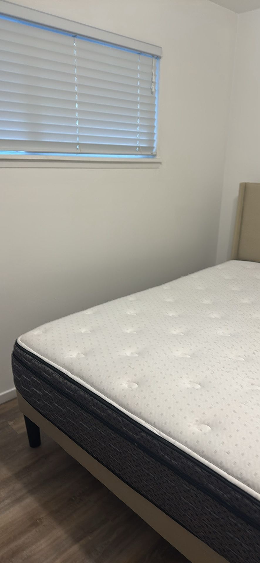 Queen size mattress with headboard frame . Color beige Mattress only being used for a year . Clean no stains no pets. Must go!!! Pick up today only !!!