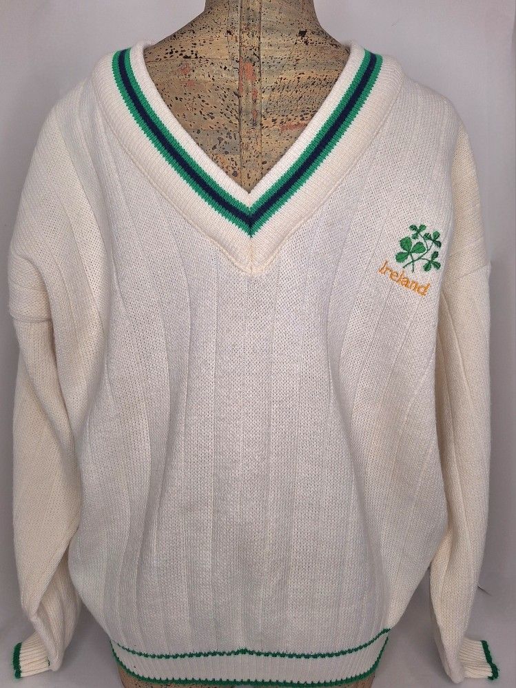 This cream colored sweater features a green and navy blue stripe trim along the V-neckline. The cuffs and hem have a green striped trim, giving it a classic cricket style. An embroidered shamrock crest is featured on the chest, with the word "Ireland" stitched in gold colored thread below it. The material is is a tight-weave acrylic, which is known for being warm and comfortable. The retro, preppy aesthetic makes it ideal for casual occasions, especially for St. Patrick's Day, as well as activities like golf. Size: XL (no size tag)