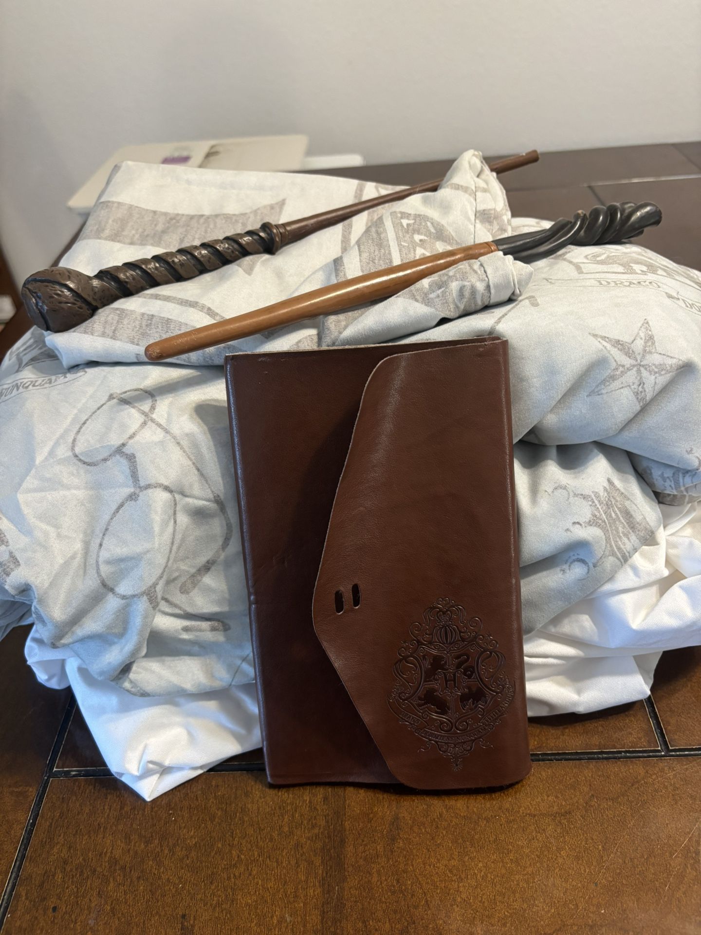 Twin mattres protector - zips up Twin fitted sheet, top sheet and pillow case 2 wands Harry Potter leather bound journal
