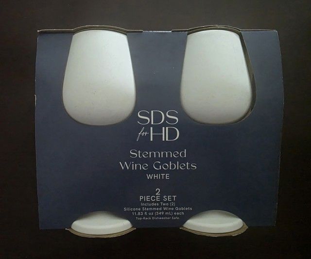 SDS for HD stemmed silicone wine goblets. Color: White 2 piece set Capacity: 11.83 oz (349 mL) each Flexible silicone construction Top-rack dishwasher safe Item appears new in original packaging. Box may show shelf wear from storage. See photos for exact condition.