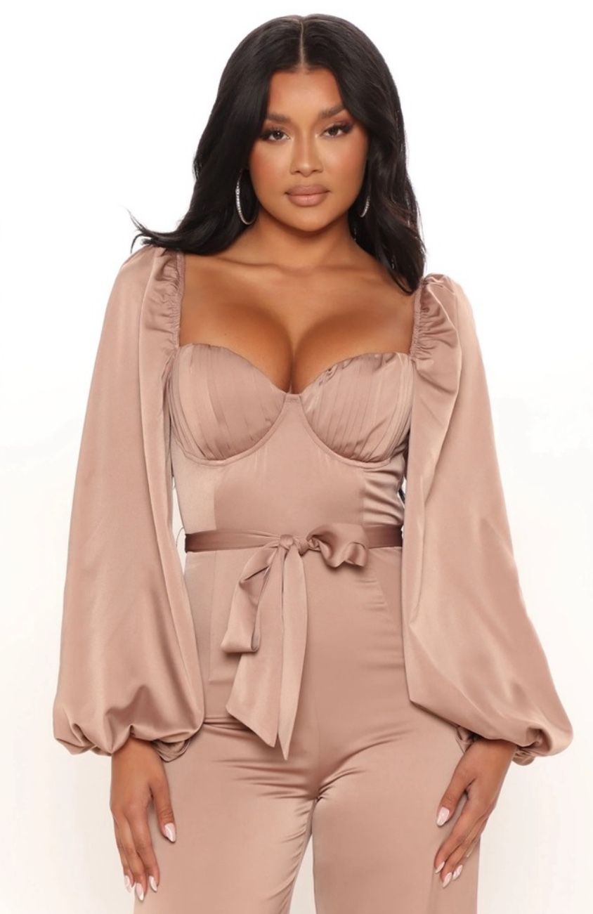 Introducing the Venice Satin Mocha Jumpsuit—an elegant and sophisticated piece perfect for any occasion. This jumpsuit features a rich mocha color with long puff sleeves that add a touch of drama. The padded sweetheart neckline creates a flattering silhouette, while the smocked back ensures a comfortable fit. Designed with a functional side zipper for ease, the jumpsuit boasts wide-leg pants that offer both style and comfort. Made from a blend of 95% polyester and 5% spandex, with a 100% polyester lining, it offers a slight stretch for added flexibility. Imported and beautifully crafted, this jumpsuit is a must-have addition to your wardrobe.