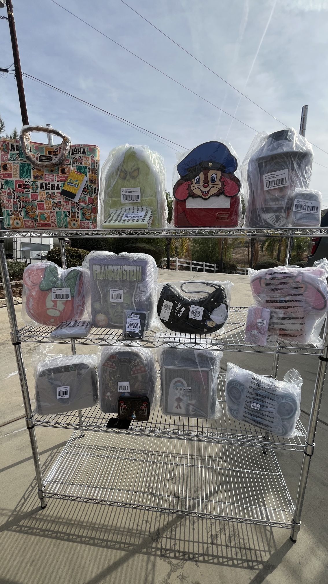 Mini Loungefly Backpacks/bags: Row 1 (top) *SpongeBob tote 2 available $50 each * Dr. Seuss' How The Grinch Stole Christmas! Plush Cosplay Glow Mini bkpk & Zip Around Wallet $100 *An American Tail exclusive Fievel mini bkpk $60 * The NBC exc. Mayor spinning head crossbody & accordion zip around wallet $120 Row 2 * Stitch shoppe Minnie Mouse pumpkin balloon crossbody (sold) Mickey Mouse pumpkin zip around wallet $$20 * Frankenstein Universal Monsters mini bkpk and accordion wallet $90 * Coraline Key Chain Glow-In-The-Dark Shoulder Bag $45(sold) * Sanrio My Melody Pumpkin Crossbuddies® Cosplay Crossbody Bag with Coin Bag and Sanrio My Melody Pumpkin Card Holder $65 Row 3 * The NBC Tarot card hand bag $65 (sold) * Disney Alice in Wonderland Mushrooms Mini Backpack - BoxLunch Exclusive and matching zip around wallet $100 (sold) *The Haunted Mansion Plaque Glow Crossbody Bag With Coin Bag & The Haunted Mansion Exclusive The Black Widow Bride Glow Large Card Holder $80 * Corpse Bride Butterfly Lenticular Crossbody Bag $55 Please let me know if you need to see stock photos. All backpacks/ wallets come from non-smoking home. Price is firm. No shipping. No dropping off. These items must be picked up. Only serious buyers. Thank you for looking.