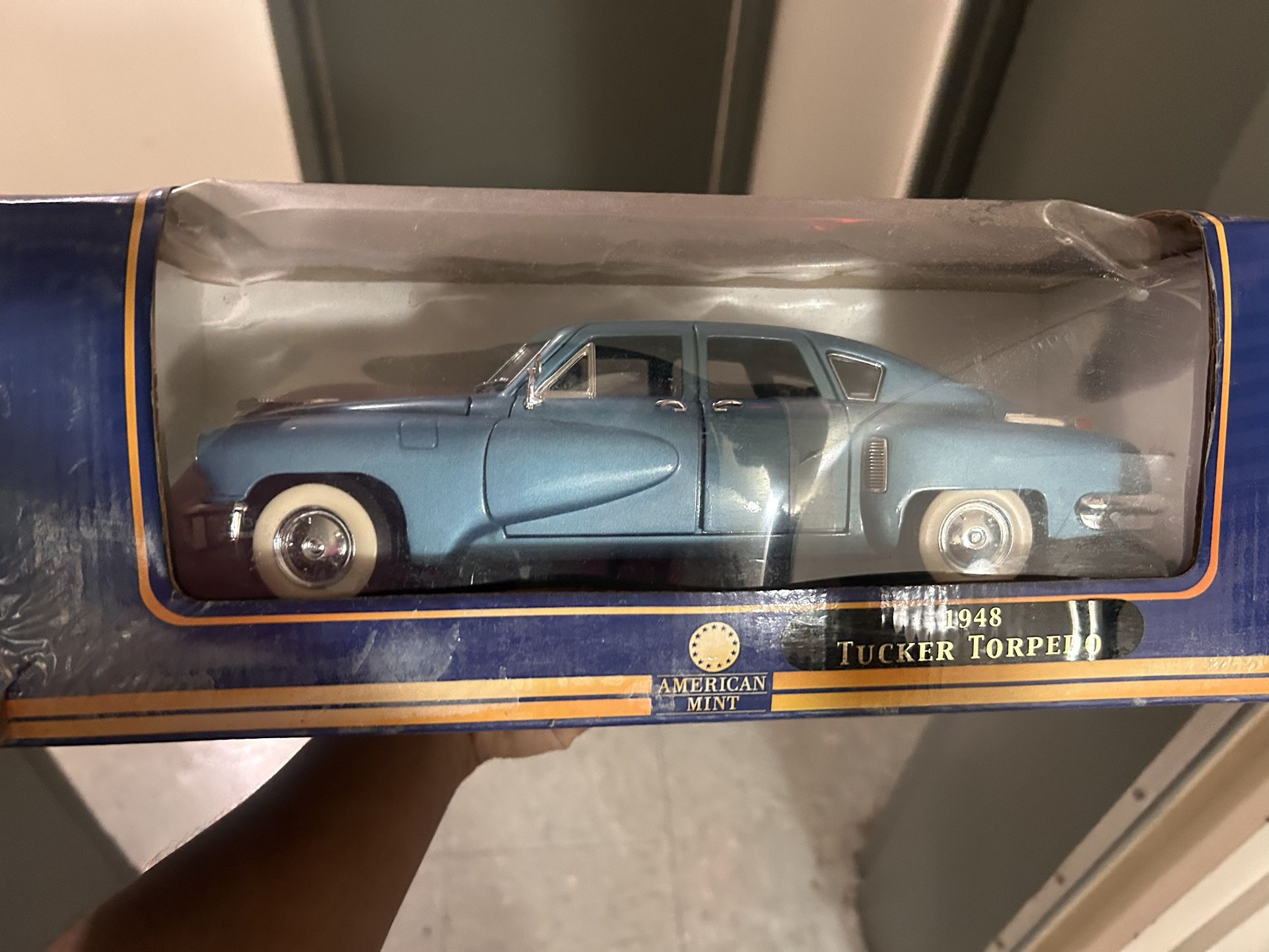 Vintage American Mint 1948 Tucker Torpedo diecast collectible. Includes original box (box shows wear from storage). Model is in good display condition. Highly collectible classic car model. Estate sale item. Pickup only in Brooklyn. Cash/Zelle preferred.