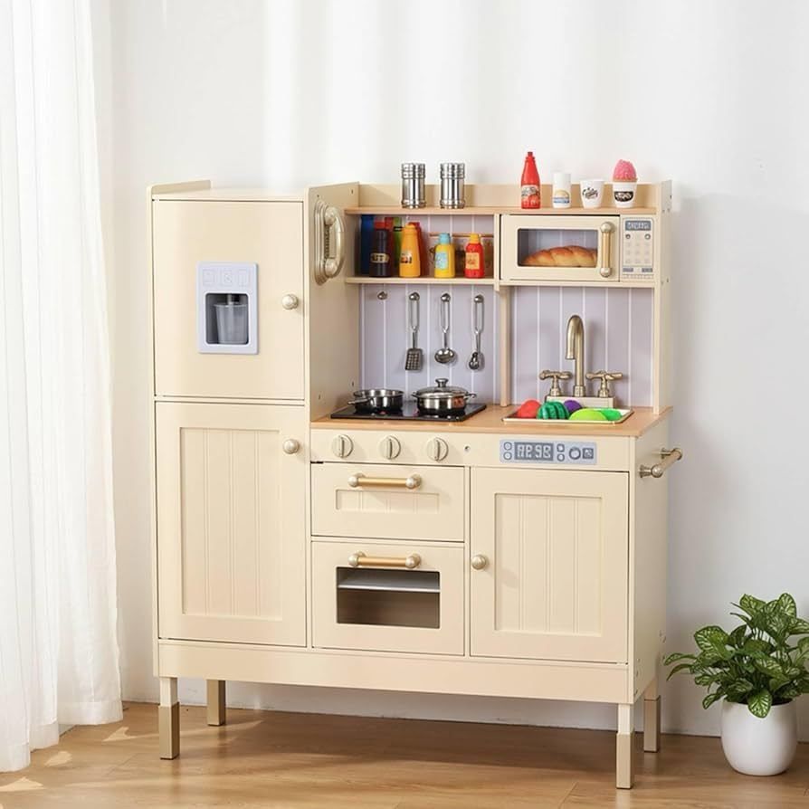 B724 $55 Play Kitchen for Kids, Wooden Toy Toddler Kitchen Sets, Pretend Cooking Playset with Storage & Accessories, Realistic Light & Sound, Stove, Fridge, Microwave, Removable Sink (Beige STURDY & SAFE MATERIAL: Kids toy kichten set meet ASTM and CPSIA safety standards and uses eco-friendly MDF with rounded polished corners and smooth surface finish to protect your child during playtime, from materials to details REALIZE KIDS' CHEF DREAM: Give your child a real kitchen playset complete with gas stove, ice maker and oven. They can enjoy endless cooking and pretend playing fun. Turn knobs on the stove for sound effects, and push ice machine produces ice cubes. This kitchen toy encourages learning through hands-on cooking and develops good habits from an early age ADJUSTABLE HEIGHT & AMPLE STORAGE: Our toddler kitchen has detachable raised foot covers which allow you to choose from 3 heights (38"/39.5"/40.5"). The suction buckle design ensures the door closes easily. Multiple cabinets and open shelves provide roomy storage space for gloves, apron, play food, cookware, and more MORE FUN WITH ROLE PLAY PLAY: Encourage imaginative play and social interaction with this wooden kitchen playset. This pretend play kitchen set provides the perfect space for kids to imitate their parents' cooking. Children can explore the kitchen, role play and develop their language and social skills. Making it practical and thoughtful for christmas and birthday EASY ASSEMBLY & CLEANING: Our toy kitchen is carefully designed to be easy to assemble and comes with detailed instructions. With detailed instructions, this wooden kitchen play set can be assembled in under an hour. The smooth surface of the kitchen utensil can be easily wiped clean with a damp cloth ekk0037/ly-13 beige