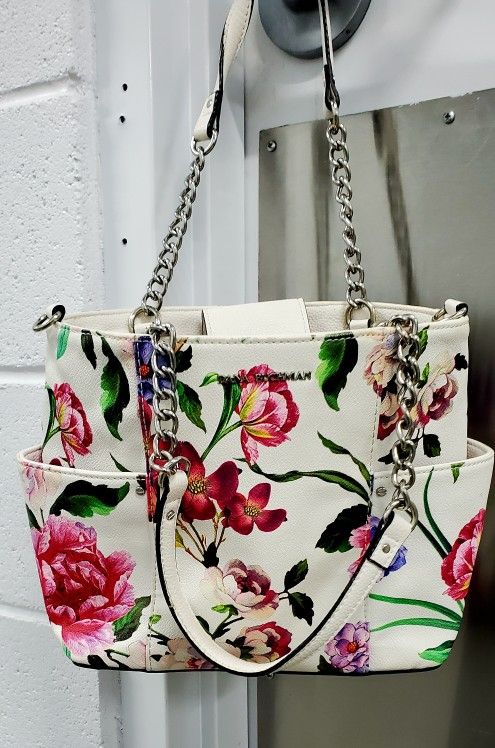 This beautiful Dana Buchman purse, priced to sell at $30. It features a white background with a floral pattern, predominantly showcasing pink and purple flowers with green leaves. The purse has silver chain straps and a white interior lining. The "Dana Buchman" logo is subtly displayed in silver lettering on the exterior. It appears to be a tote style, suitable for carrying everyday items. Dana Buchman is known for creating bags with attention to detail, quality materials, and elegant designs.