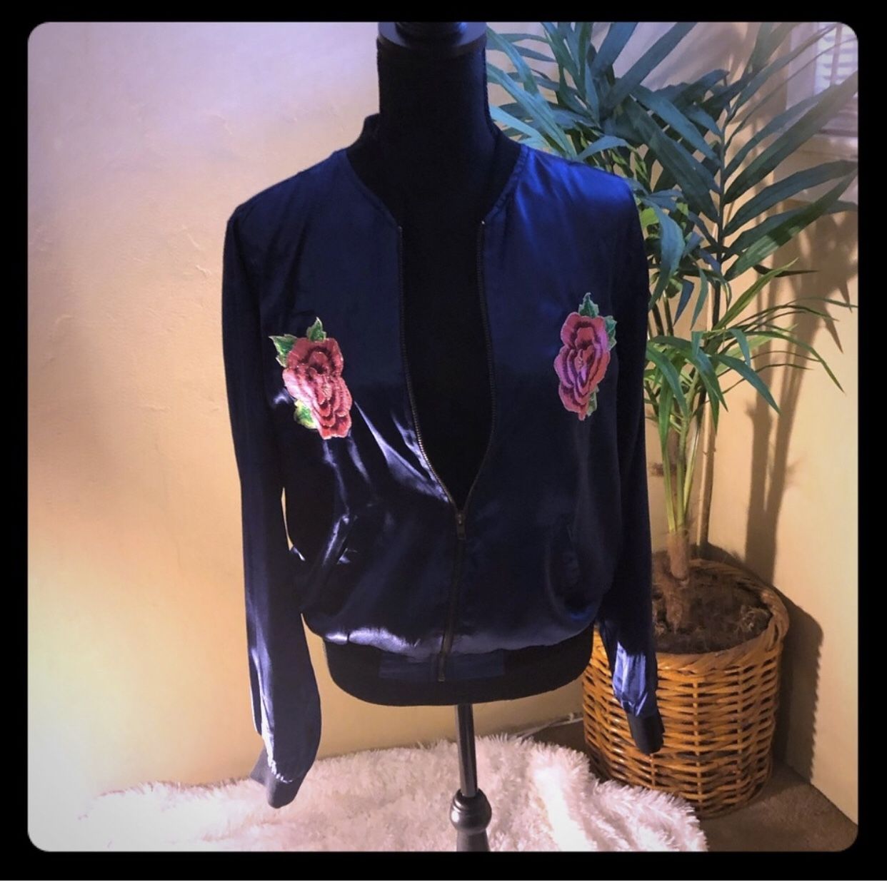 This zip up jacket is so cute! it has a flower on both sides and its perfect for a warm spring day or summer night. It is simply hot🔥 Can be worn with jeans or dress it up! The material is polyester with a silk/ satin like feel to it! Never worn. Grab it today!