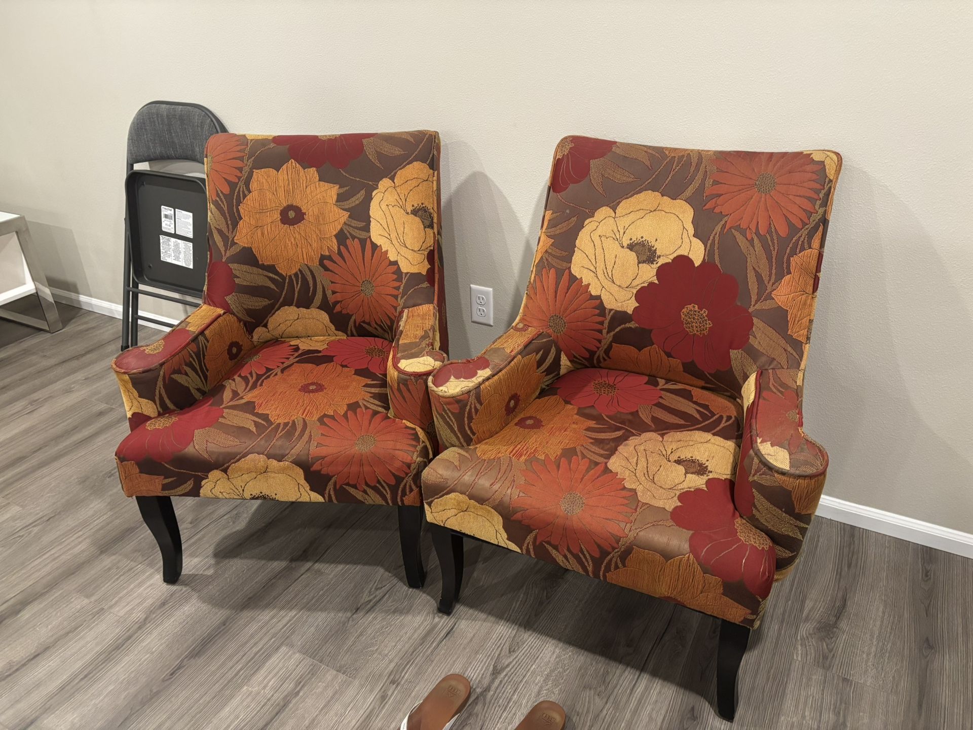 Kept in a smoke free and pet free home. Selling because we are redecorating the home and this doesn’t fit the theme. Both are in good condition though the stitching on one chair is coming off in a corner and sides are flighty fraying. Very well built with solid wood legs and high quality materials. Pickup in Olympia Area only.