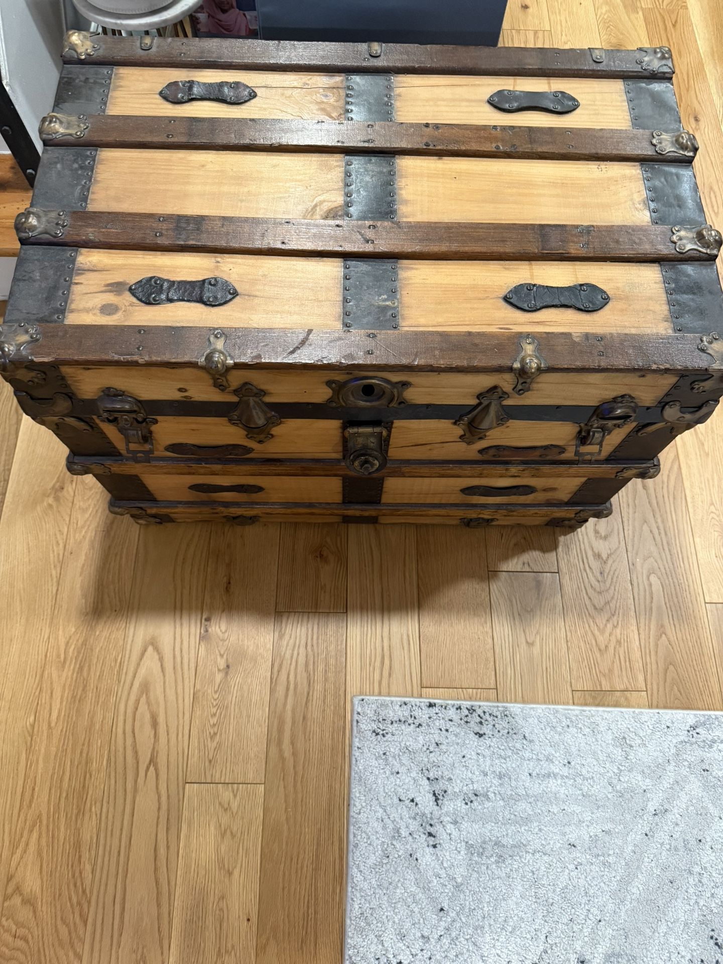 Restored trunk purchased through an antique shop a few years ago. Has an inner tray! Used for light storage and decoration in house and I’m ready to get it into the hands of someone else looking for this sort of piece. Dimensions 33” long 22” wide 23” high