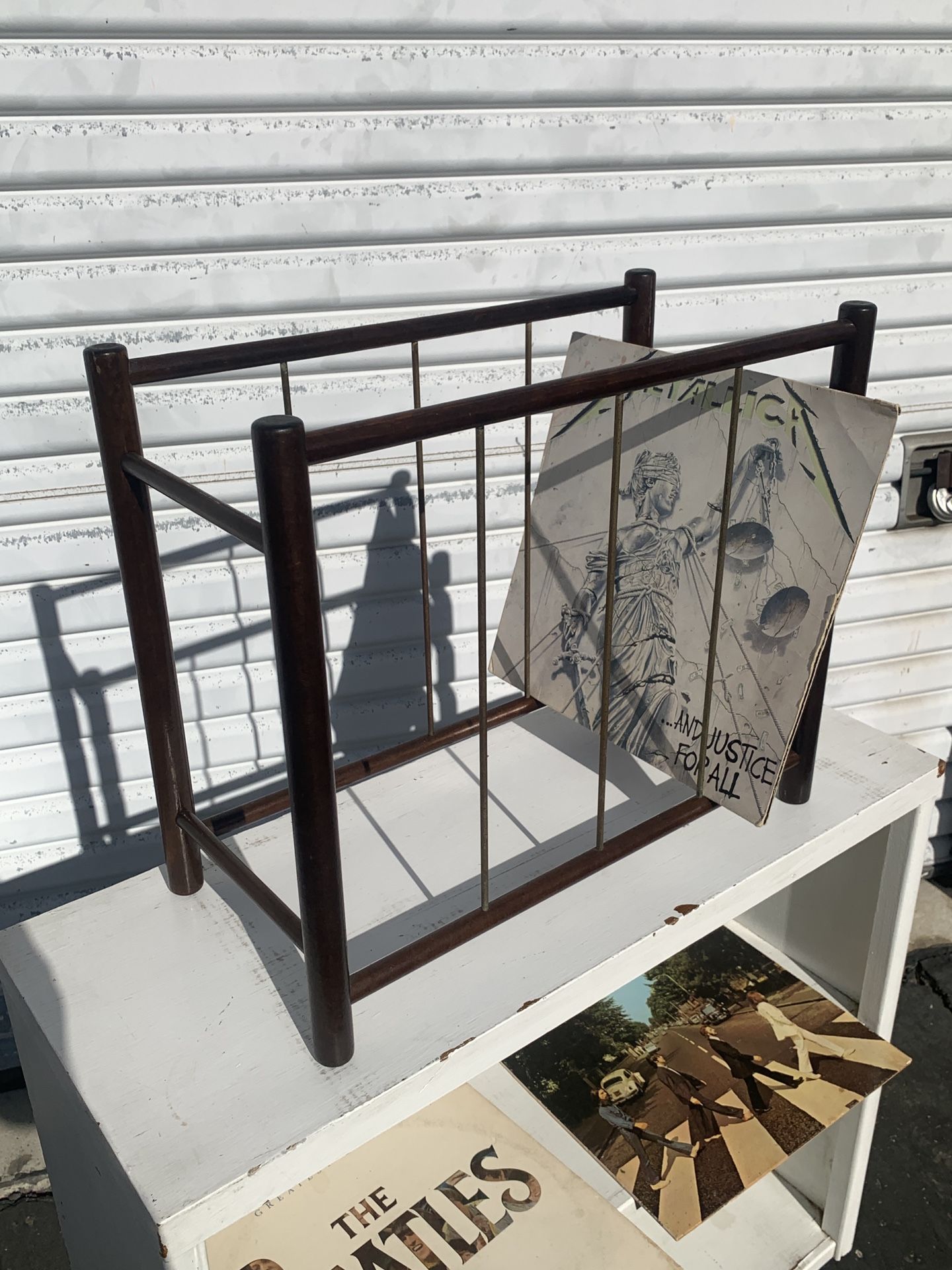 Pre owned Vintage Mid Century Modern wood and metal Magazine LP Vinyl Rack. In excellent condition.