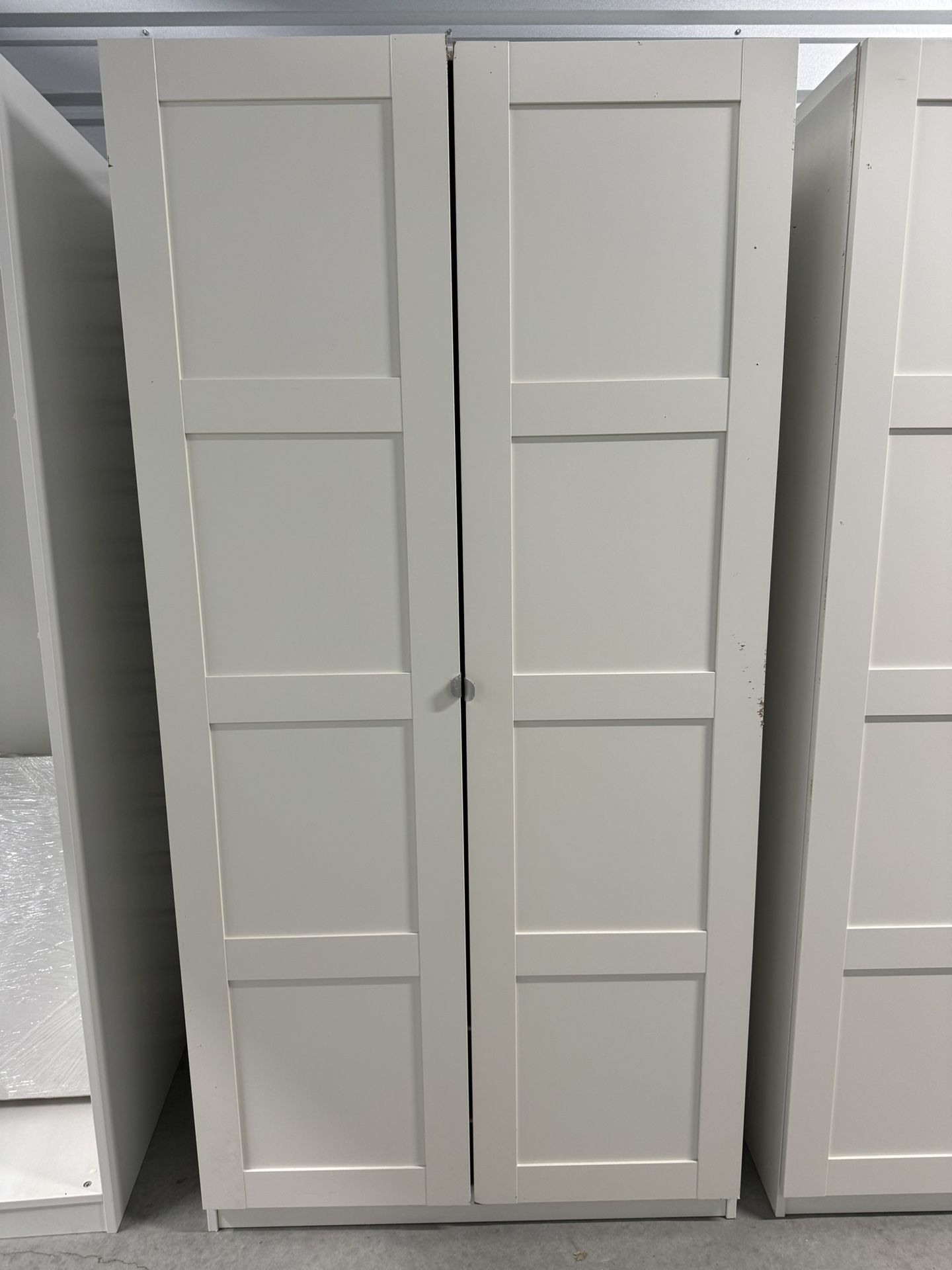 Price is for all. 2 closets with doors + one without pictured as an open shelving unit + 3 bookshelves (see pictures) Dimensions below Both Closets with doors are 39 3/8 inches long by 79 inches tall. Open cabinet is 29 1/4 inches long by 79 inches tall Bookshelves are 58 inches tall or laying down on the side and 16 inches in width Located at our storage unit in Encintas - the U Store 1509 Encinitas Blvd. Encinitas, CA 92024