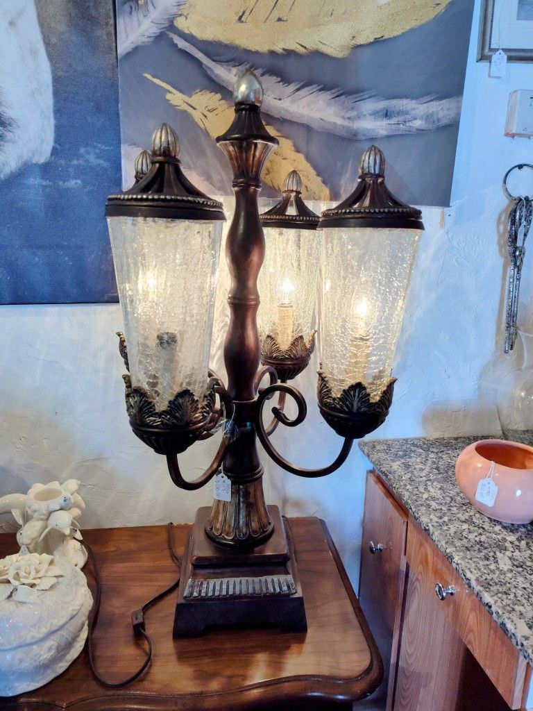 4 light bulb antique lamp in great working and cosmetic condition with no issues.