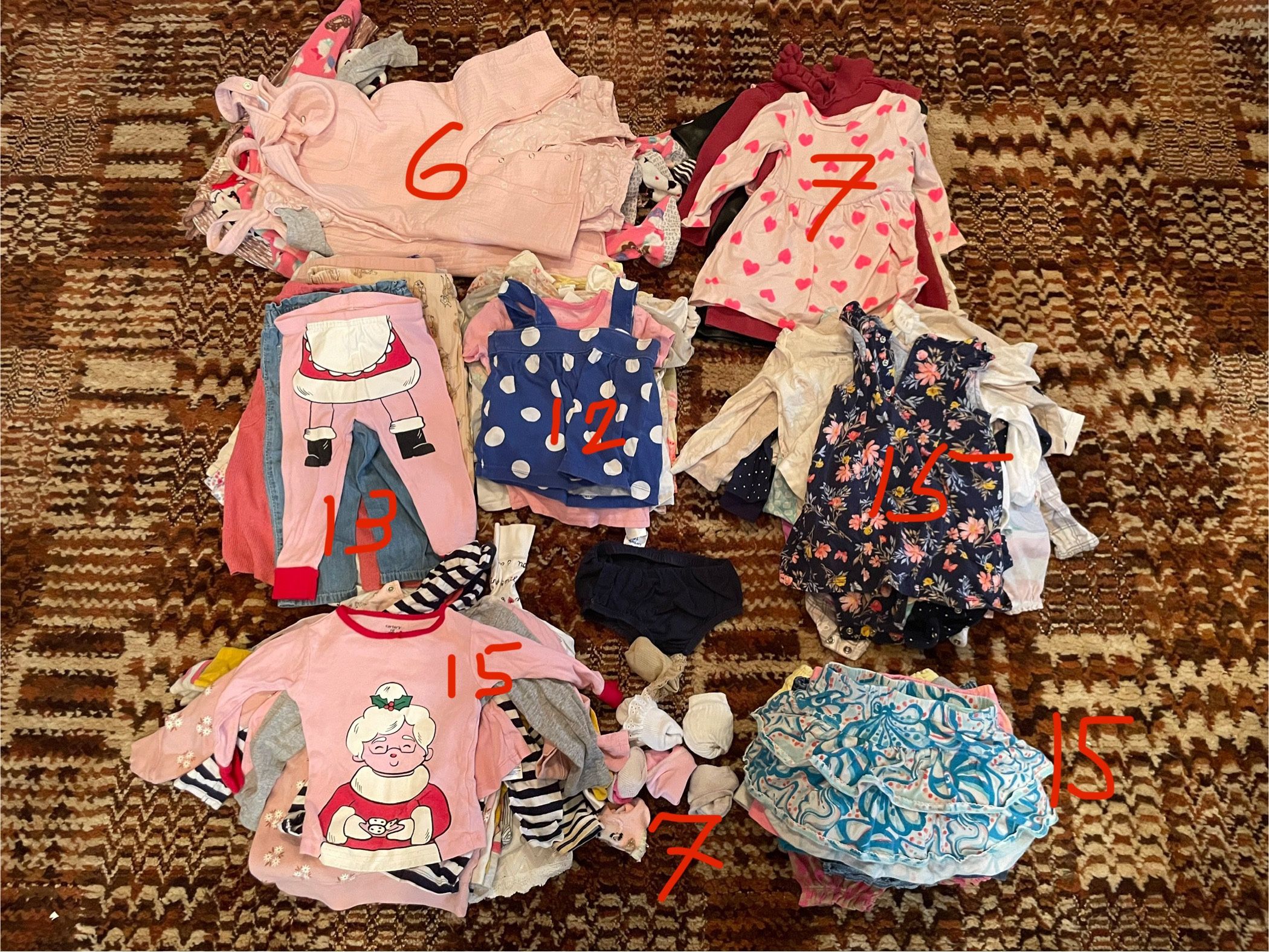 Clothes for girl. $0.50 if you take all 740 items, or $1 per item. Sizes: NB, 0-3M, 3M-6M, 6M-12M, 12M-18M, 18M-24M, 24M, 2T Dresses, shirts, sweaters, pants, Shorts, skirts, onesies, long sleeve onesies, sleep onesies, sleep sacks, hats, socks, underwear, miscellaneous items All seasons