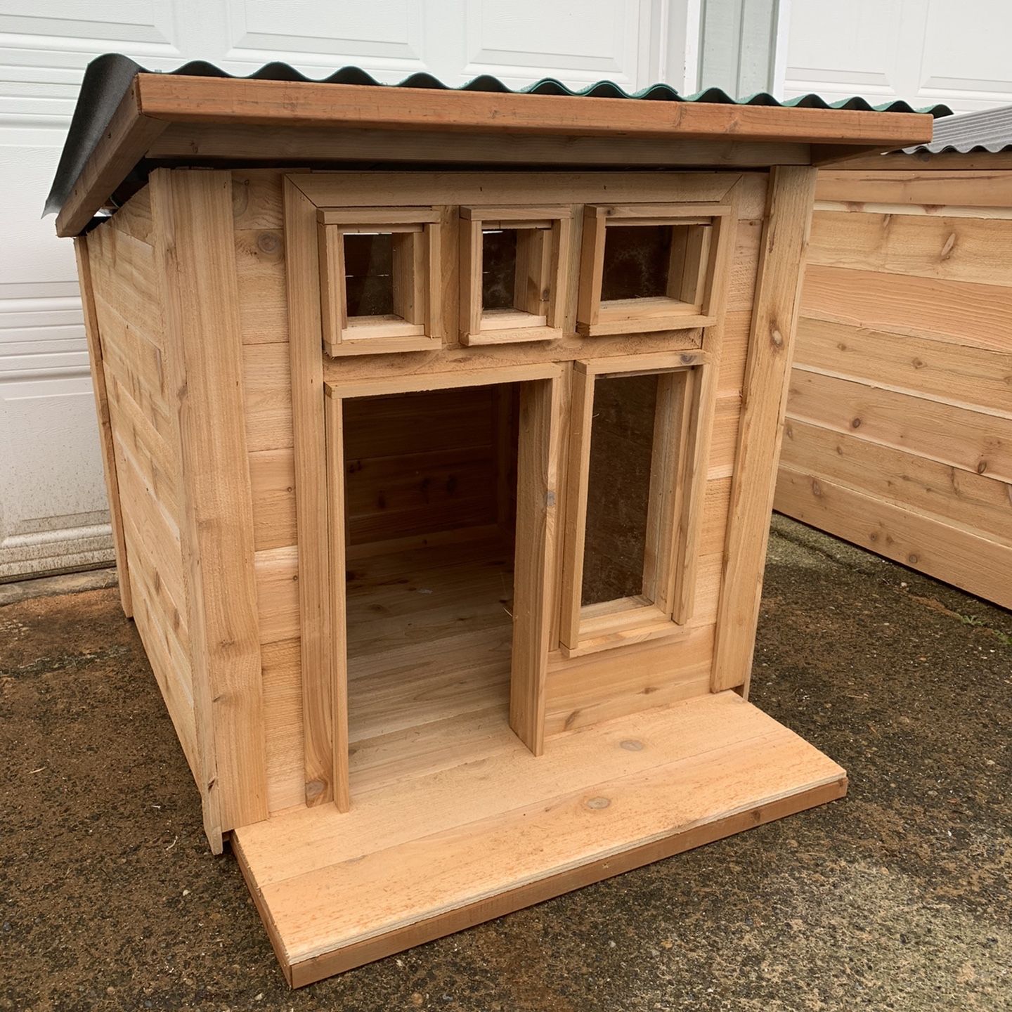 All Cedar Dog houses. Built new with all new materials. 3 ft wide x 3 ft deep x 3 ft high with 2 ft porch and 2 ft over hang on roof. Plexiglass windows. The roof opens up for easy access for cleaning. Choice of roofing between corrugated metal or corrugated heavy SunTuff poly roofing in brick red, green, or gray .