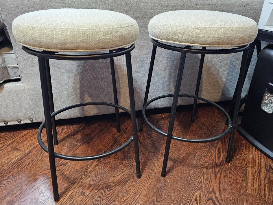 $150 for both Cash only. I have 2 swivel stools that were purchased at Homegoods about two weeks ago. Basically new as they were never really used. Decided to go with black wooden stools that would better match my table instead. I had purchased gray stool seat covers which will be included in purchase. $150 for both Cash only. Original price was $99.99 each as shown in picture.