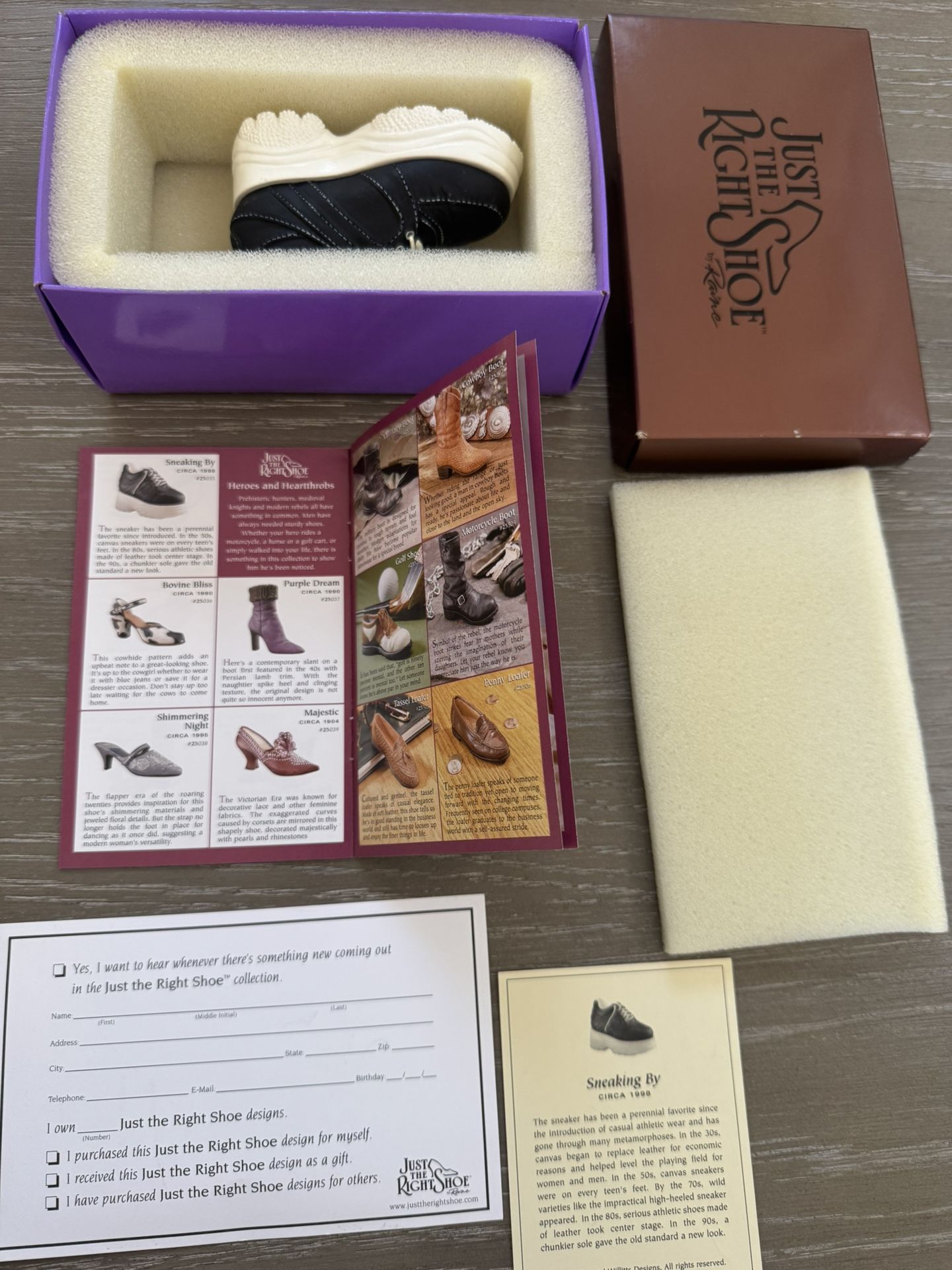 This charming “Sneaking By” collectible miniature from Just the Right Shoe (circa 1998, #25035) captures the essence of ’90s sneaker fashion with its chunky sole and leather detail. A must-have for collectors of miniature shoes or fans of vintage fashion memorabilia. Perfect condition – display only. Add it to your collection or gift it to a fashion lover!