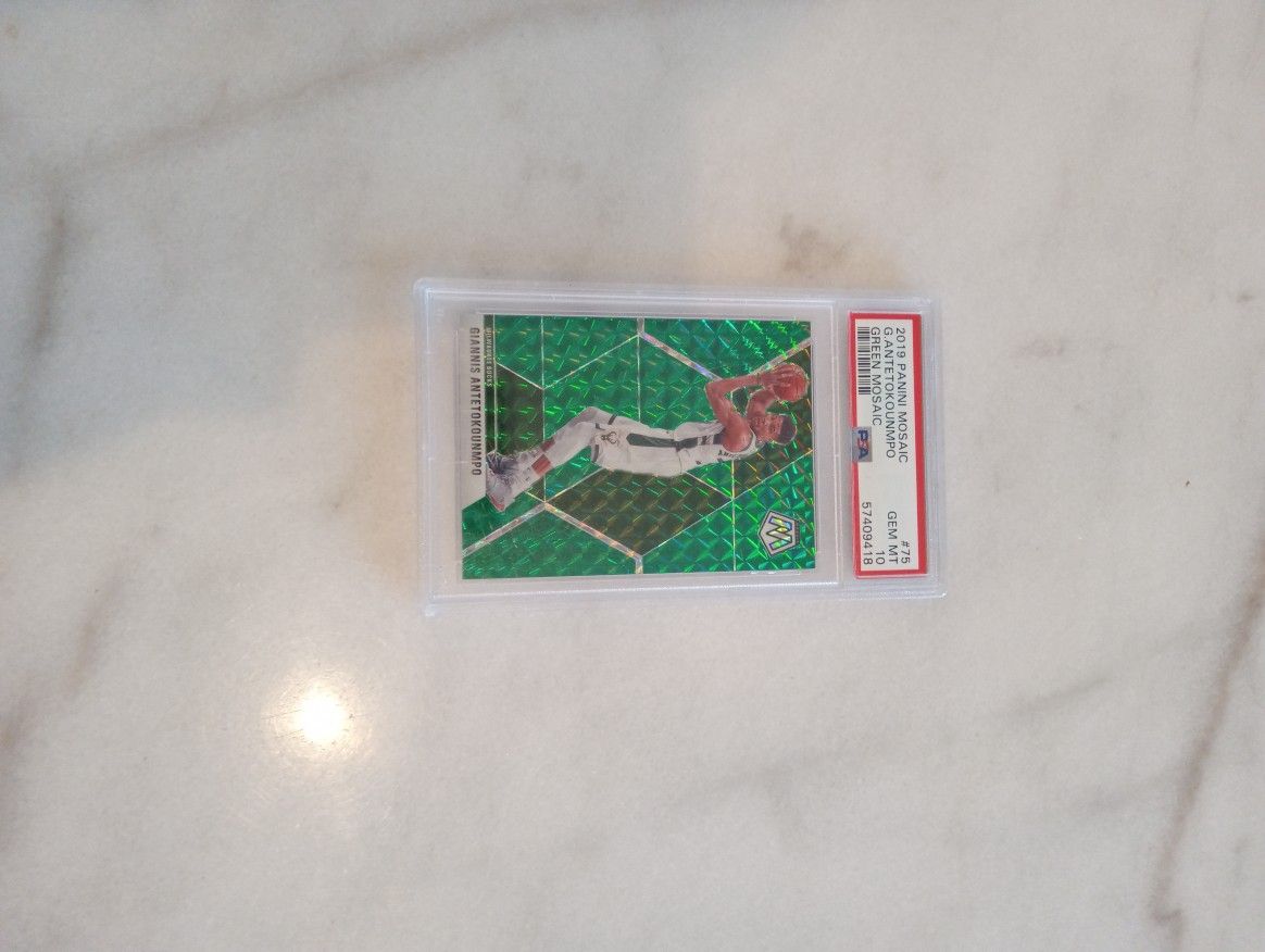 Giannis Antetokounmpo 2019-20 Panini Mosaic Green Prizm #75 basketball card, graded as a PSA 10 gem mint.