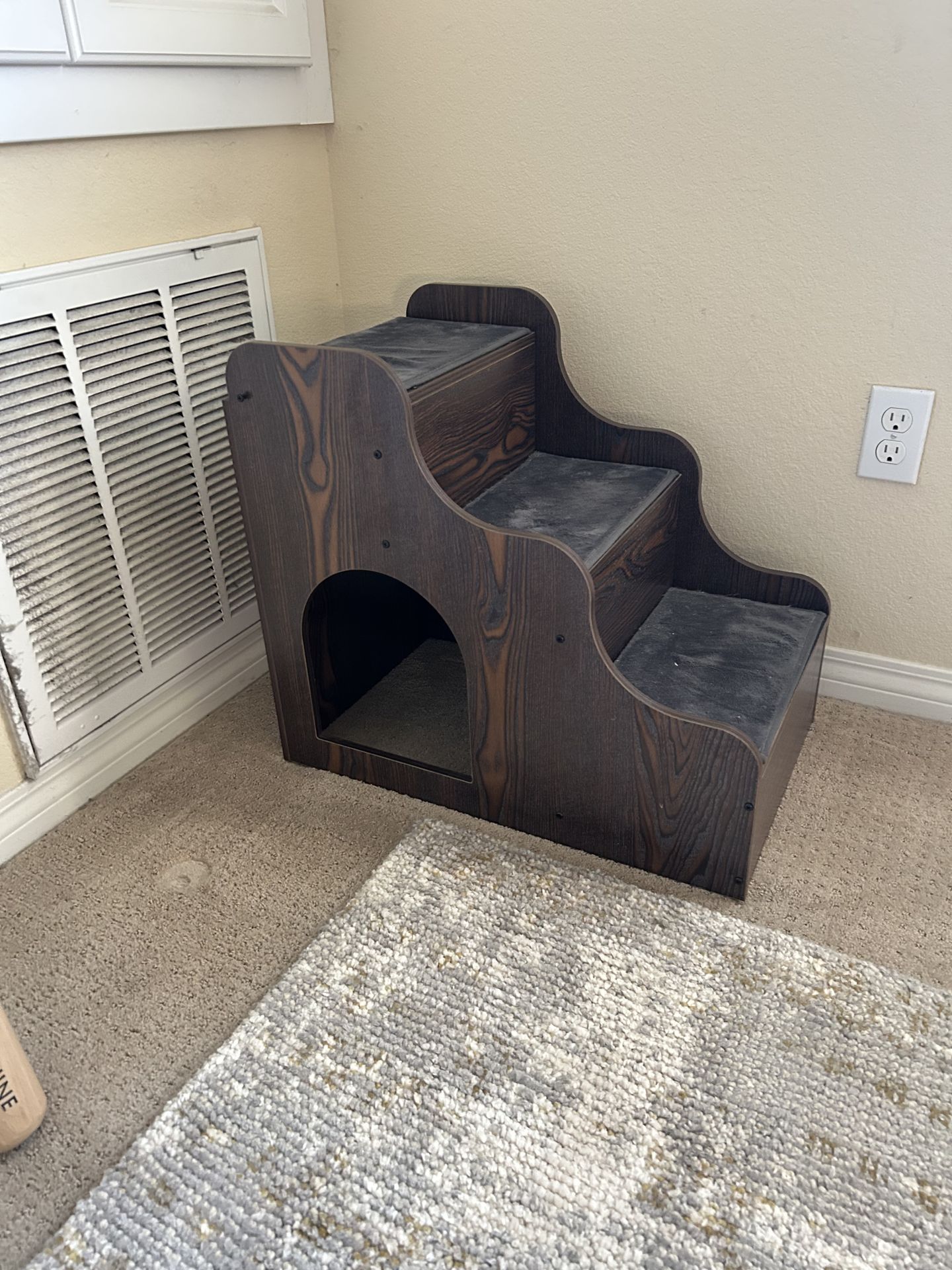 Selling a sturdy small pet step/stair unit in good condition. Perfect for small dogs or cats that need help getting onto a bed, couch, or window seat. Features: • 3-step design • Solid wood construction • Carpeted step surfaces for grip • Built-in cubby space underneath (great for small pet hideout or storage) • Very stable and durable Normal light wear from use but still solid and functional. Great for older pets, small breeds, or pets with joint issues. 📏 Compact size – fits easily next to beds or couches.