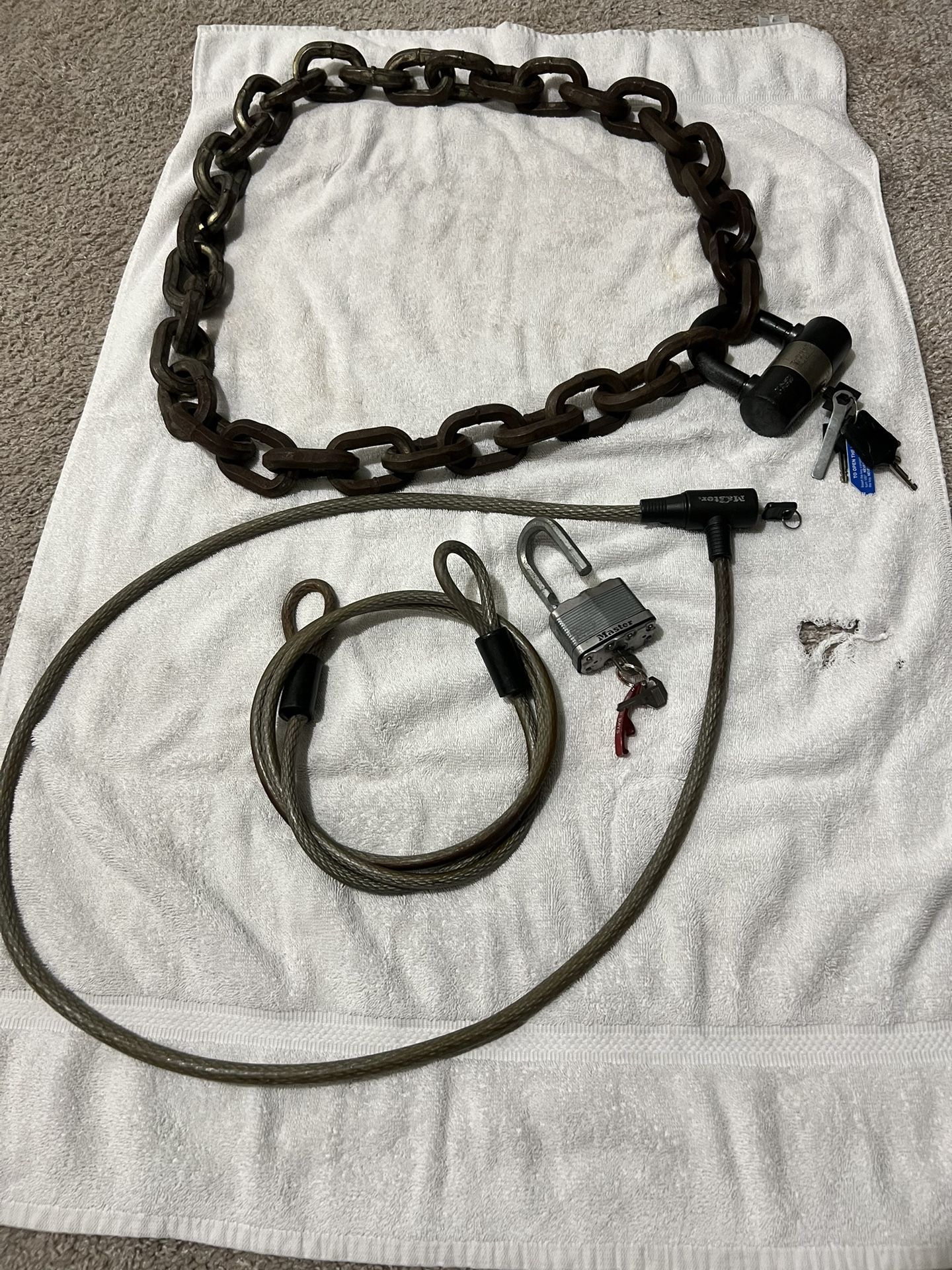 OnGuard BEAST CHAIN W/ LOCK #8016L suitable for high-value motorcycles parked on the roadside or public places in high crime areas. The 20-pound Titanium reinforced steel chain and lock can help you sleep more soundly. Original price for chain is $150. Lock cost $40. 2 .Two cable lock with a Heavy Duty Master lock