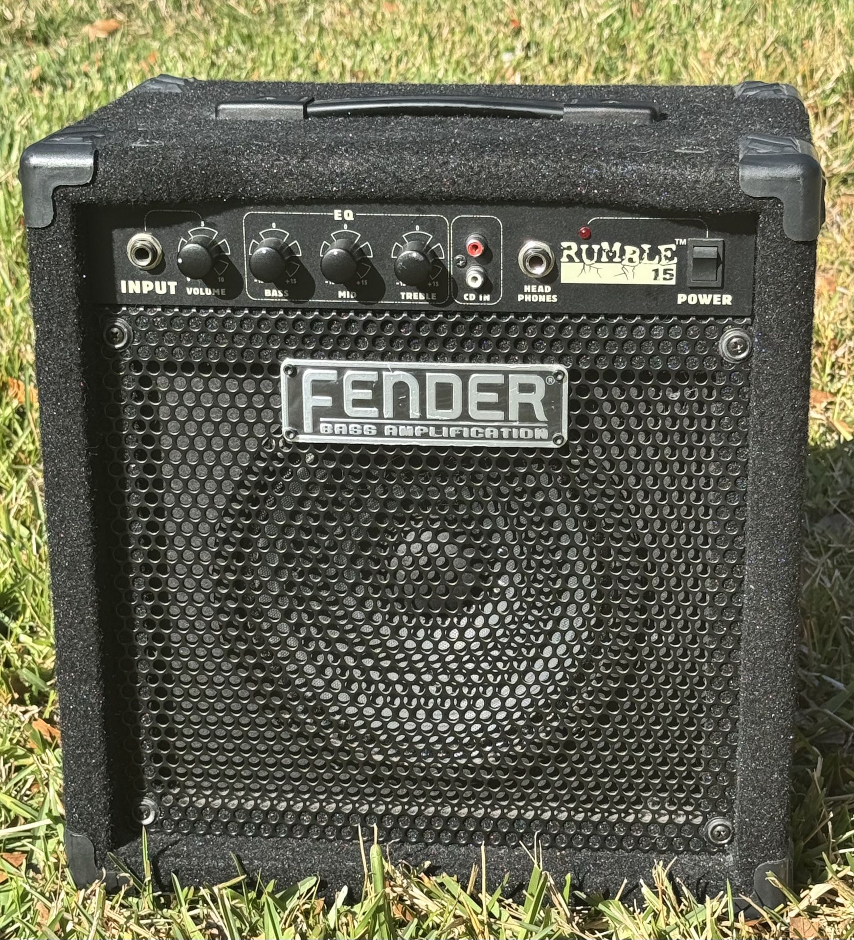 Fender bass amp in nice condition and working fine. 15 watts, 8” speaker, 3 band EQ / tone control knobs, and a headphone output. Great bedroom rehearsal amp! Pickup in Mandarin.