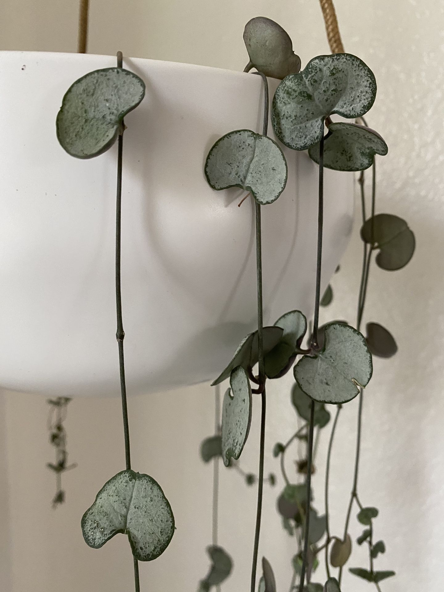 String of Hearts Silver Glory is a rare succulent. It has silver heart shaped leaves which cascade and grow long. It is growing in a 4” pot.