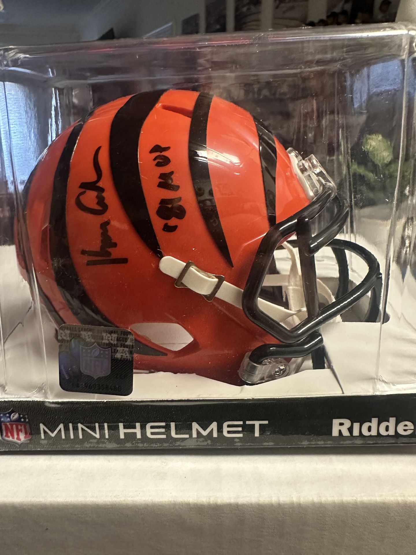 The product is a Ken Anderson signed Cincinnati Bengals speed mini helmet with the inscription "81 MVP." The autograph has been authenticated by Beckett Authentication Services (BAS) ensuring its authenticity. This collectible item is a must-have for any football fan, specifically those who are fans of the Cincinnati Bengals and Ken Anderson. The mini helmet showcases a piece of memorabilia from the NFL player, making it a valuable addition to any sports memorabilia collection.