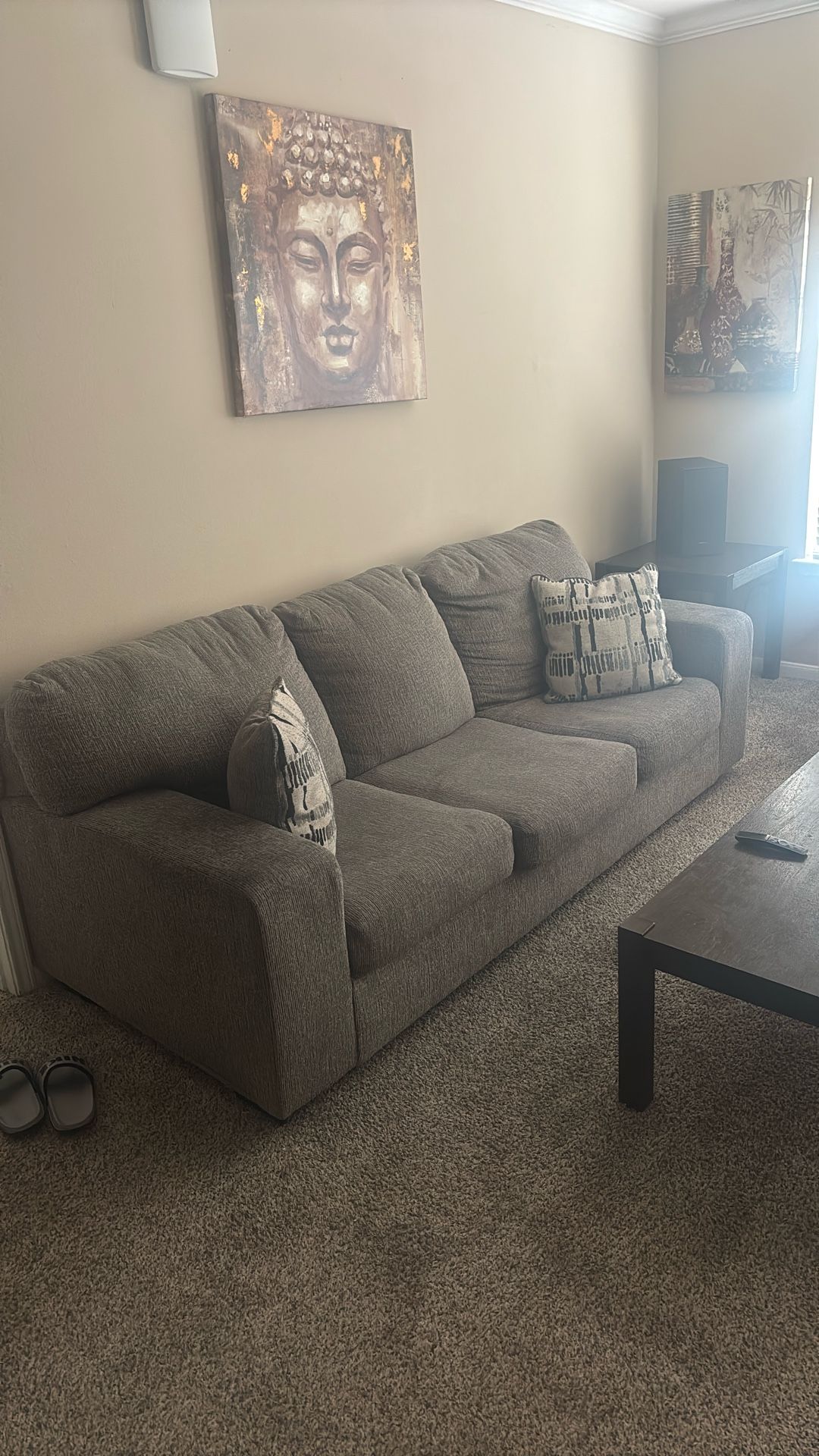 Sofa and chair needs cleaning, other than that they are in great condition. Sofa has a slight tear on the top but can be easily stitched.