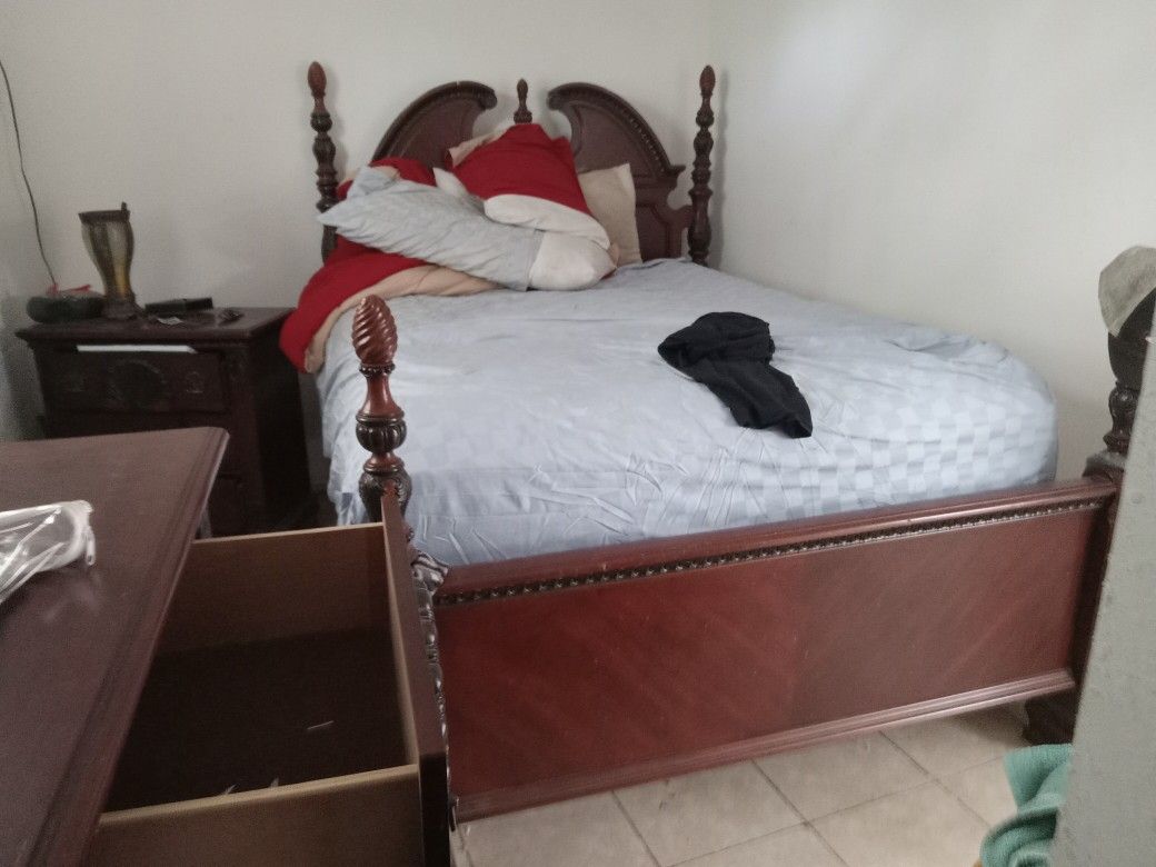 5 total pieces bedroom furniture set all like new and in excellent condition. Two night stands 1 Big 9 Drawer Dresser Big Wood Bed frame with Mirror 1 like new Queen size mattress all pieces are in excellent condition and have not been used very much at all. This is the best price you will ever get on furniture of this quality text or call must be legitimate (contact info removed)