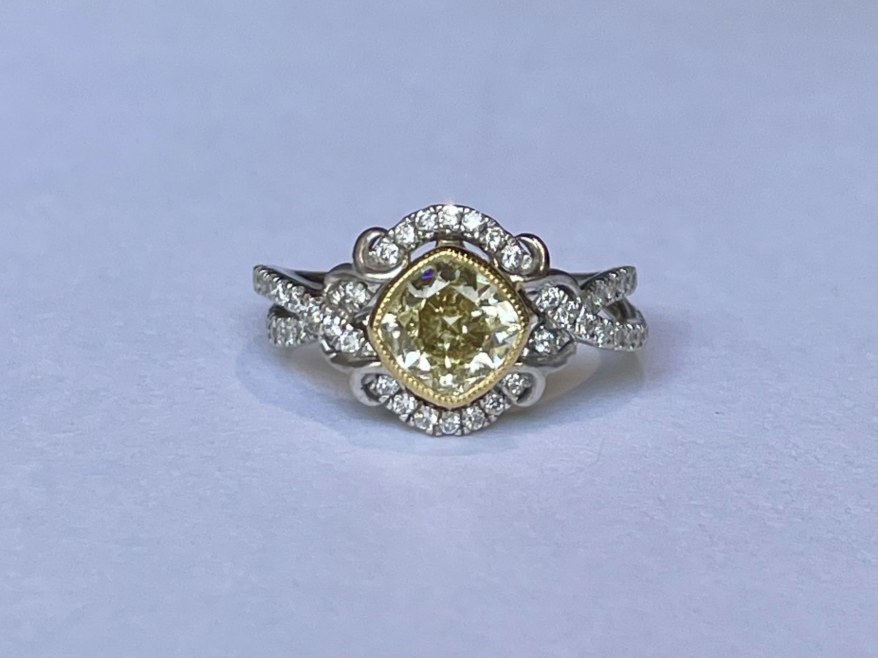 Parade Lyria ring and band. Purchased in 2018, barely worn, excellent condition. Includes original purchase documents/appraisal, official GIA certificate, and an updated appraisal from Jan 2024. Cut/Carat: One 18 karat two tone 1.42CTW diamond halo ring containing one 1.11CT cushion modified brilliant cut yellow diamond set in a 18 kt yellow gold bezel setting with migrain accents 18 karat white gold ring also contains 52 round brilliant cut diamonds Measurements: 5.95 x 5.580 x 3.81mm. Color: natural fancy yellow even Clarity: VS2 Size: 5.25y