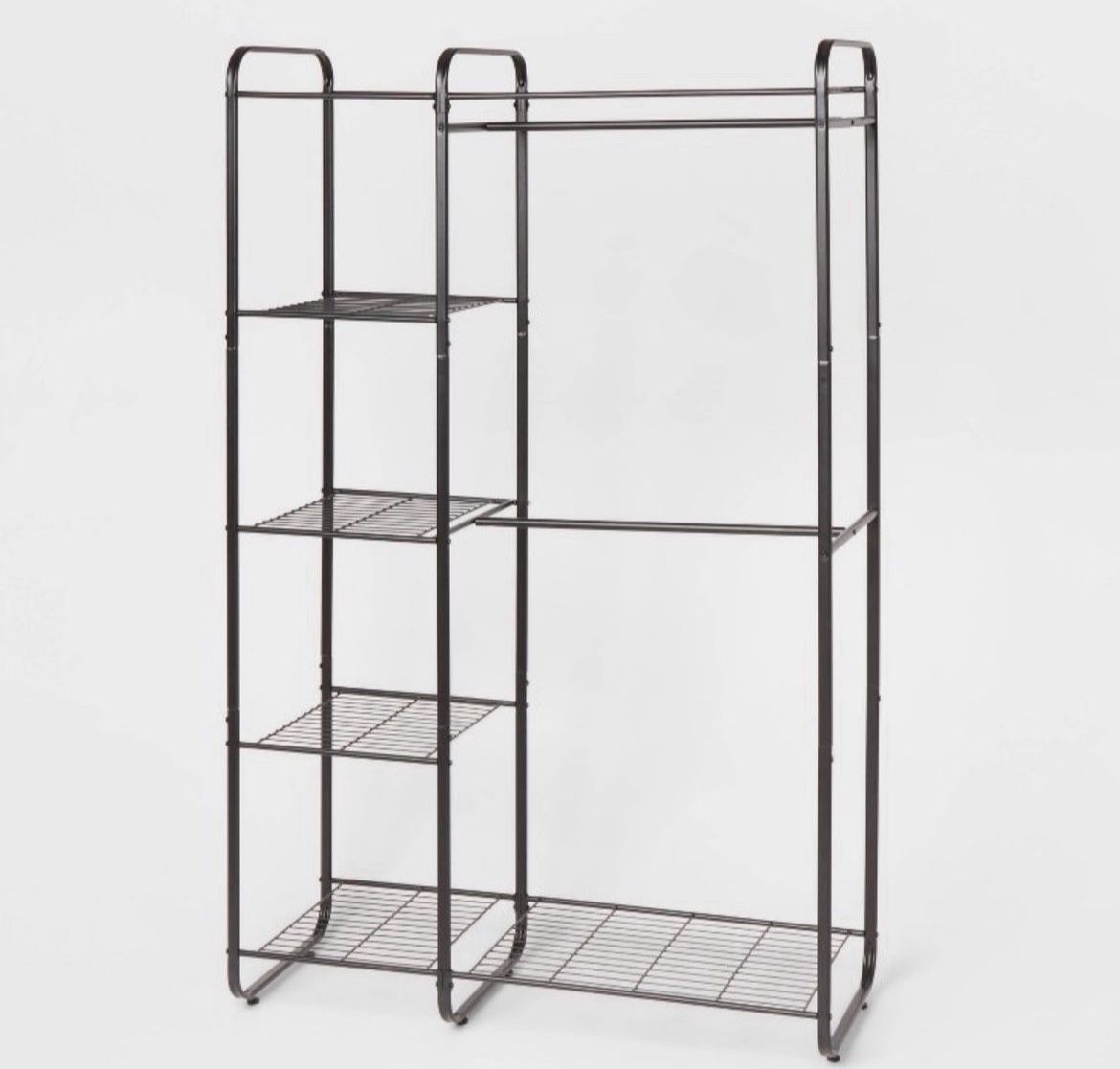 Freestanding Closet * Already Assembled *** can disassemble if asked - metal - 2 hanging rods - 2 large and 2 small metal shelves - can hold 77lbs of clothes - Dimensions (Overall): 46 Inches (L), 73 Inches (H) x 20 Inches (W ****Items in pic not Included ***** FREE HANGERS if you’d like them.3rd pic Bought at target for 65$ LIKE NEW OBO
