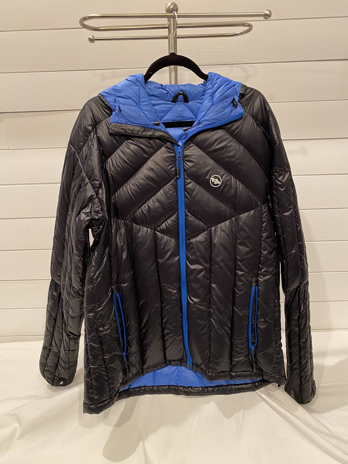 Big Agnes Men’s Shovelhead Hood Down Jacket Size: Men’s X-Large Color: black with neon blue zipper accents. Details: * Nylon ripstop shell * 700-fill down insulation with DownTek treatment * Contoured fit * Fixed hood * Insotect Flow baffle construction with Flow Gates * One internal chest and two zippered hand pockets * Jacket compresses into one of the large internal mesh pockets