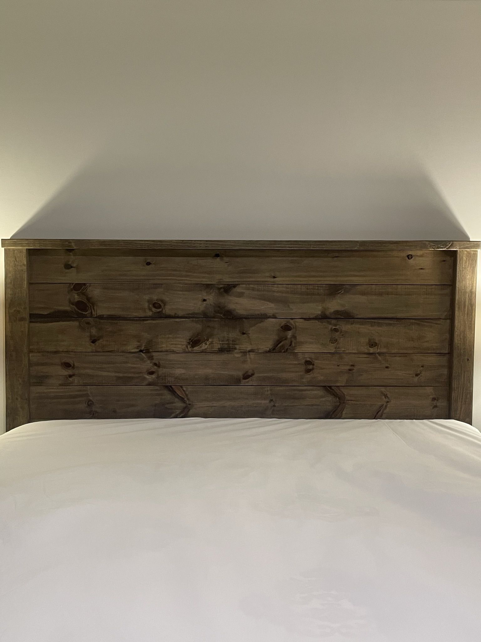 Solid wood separate from bed frame, has legs. Measurements - 78 width, 58 inches height including legs, backboard starts at 28 inches, 3.5 inches deep.