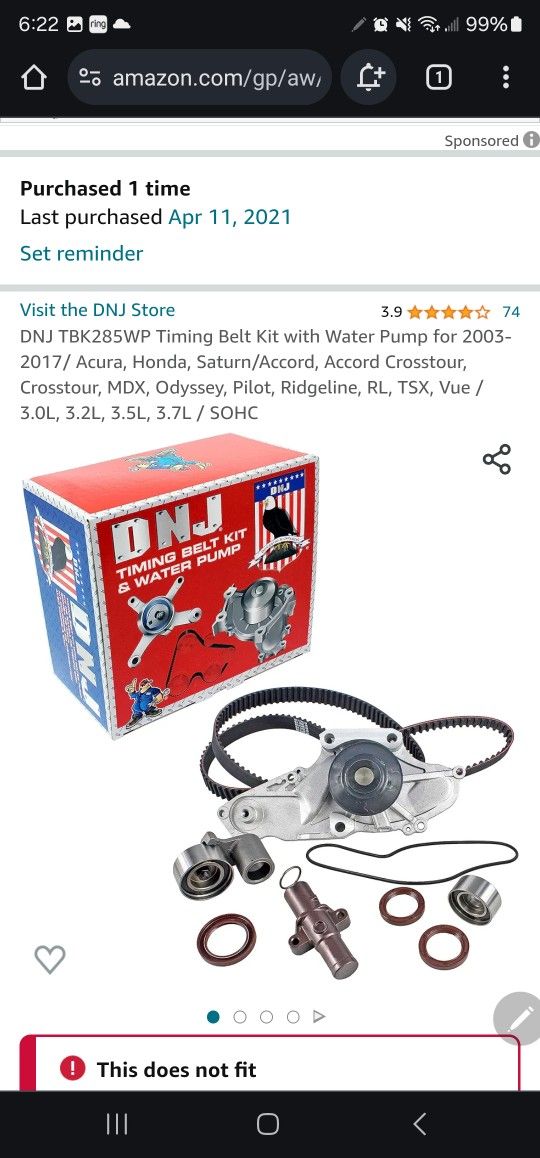 Brandnew in the box I purchase it for my 2010 Acura tl, but I no longer have that vehicle I have no need for it brandnew DNJ TBK285WP Timing Belt Kit with Water Pump for 2003-2017/ Acura, Honda, Saturn/Accord, Accord Crosstour, Crosstour, MDX, Odyssey, Pilot, Ridgeline, RL, TSX, Vue / 3.0L, 3.2L, 3.5L, 3.7L / SOHC If interested I can send pictures of the item brandew in the box right here so all you have to do is tell me your interested in purchasing ty God bless everyone