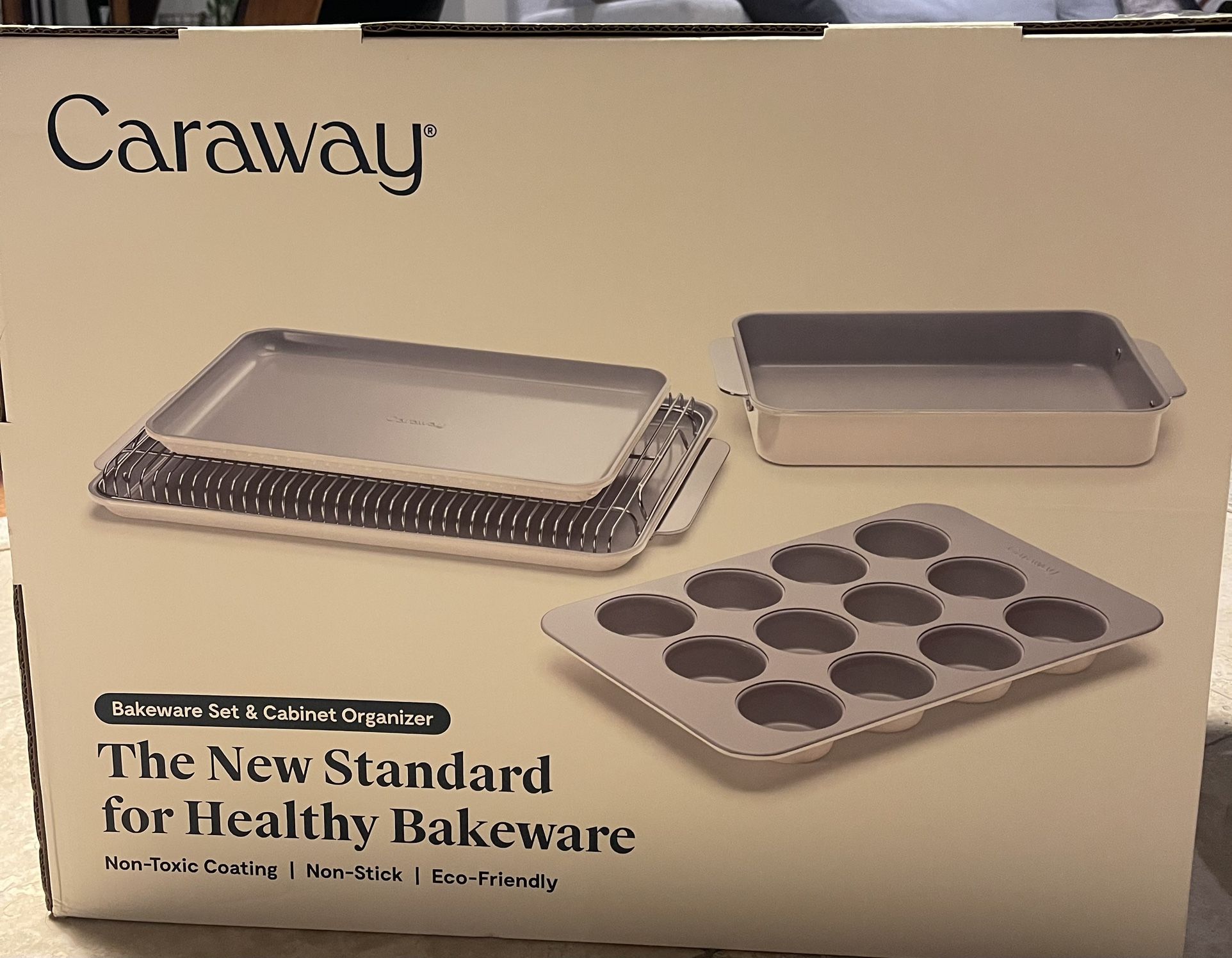 Brand new, unused 6-Piece Bakeware Set from Caraway. Set includes: -Organizer rack -18x13” Baking Sheet -18x13” Wire Rack Baking Sheet -15x10” Baking Sheet -12 Cup Muffin Pan -13x9” Rectangle Pan Non-Toxic, Non-Stick, Oven Safe (550°F Max Heat), Ergonomic Handles 70,000+ 5-Star Reviews