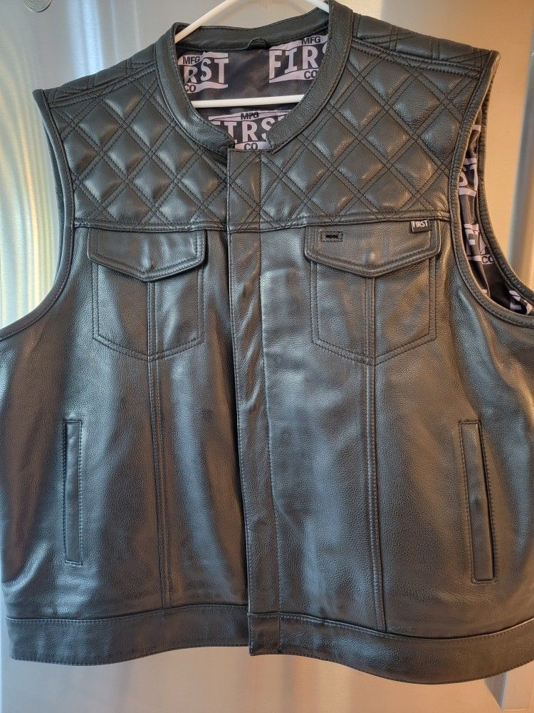 Only used a few times. Size is a 5x FMCo SIGNATURE LEATHER VEST Here it is - our SIGNATURE vest! We took fan favorite features from many of our vests to create our favorite! This is a club style vest, with a one inch collar, a cropped center zipper for comfort, that's hidden by covered snaps. The shoulders feature our black double diamond stitching. Plenty of pockets, including two conceal carry pockets. The satin liner with FMCo logos is easy access - so you can just unzip to add patches or embroideries. And always, it's got our Lifetime Warranty! Features: Diamond Naked Cowhide Leather 1.1 - 1.2 em Club style with one inch collar and covered snaps Cropped center zipper Double diamond stitching on shoulder Black stitching Two snap chest pockets Two snap slash pockets Three panel black satin FMCo logo liner Quick access conceal carry pocket on the left side Interior conceal carry pocket on the right side Interior cellphone pocket on left side Easy access liner panels for patches and embroideries YKK zippers