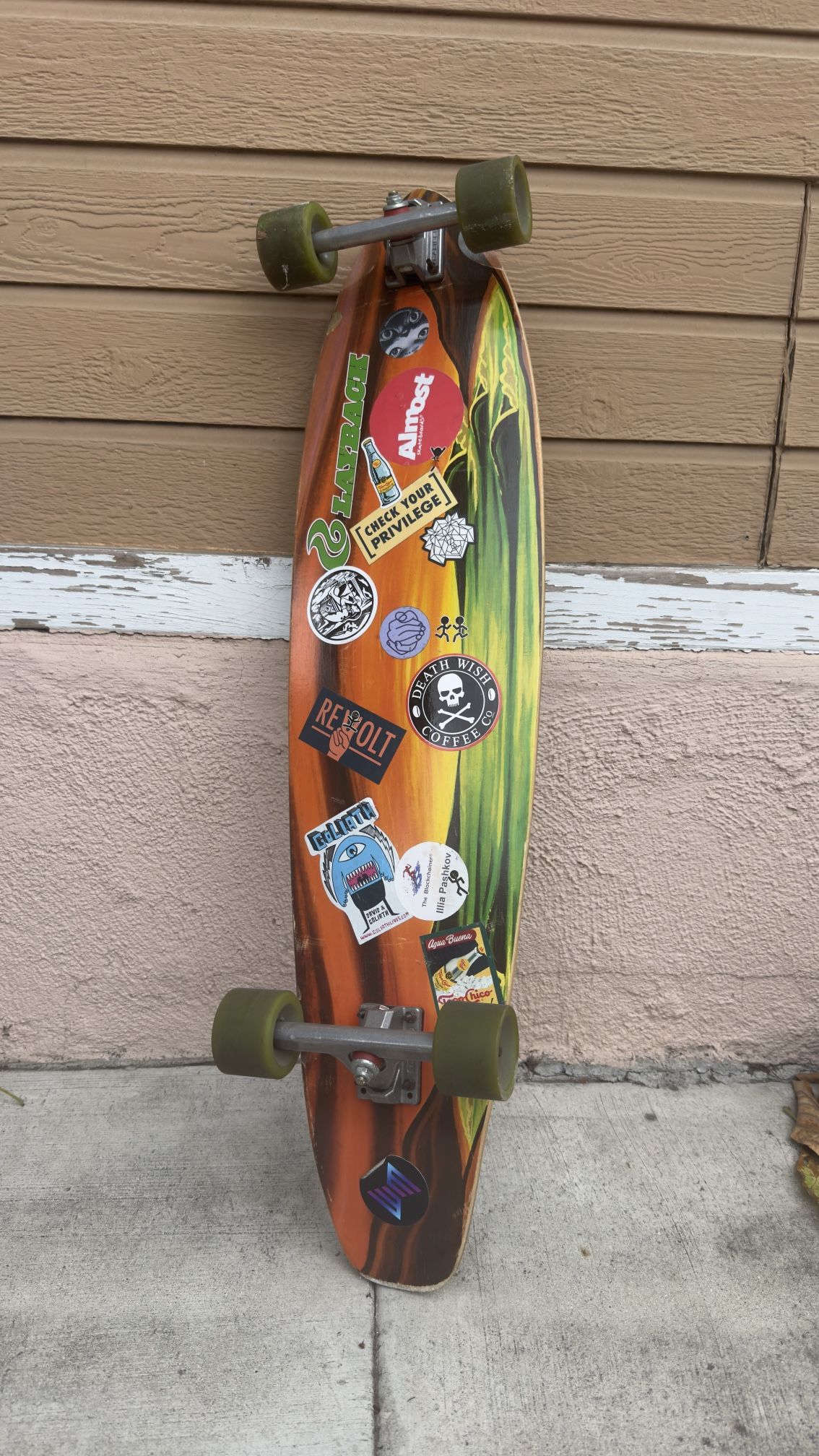 Pre-owned longboard skateboard with a vibrant wood-grain deck covered in unique stickers for a custom look. Deck length: approx. 40" Trucks: standard metal trucks Wheels: large soft wheels (green, smooth ride) Condition: Used, solid structure, cosmetic wear on deck & wheels, fully functional Ideal for cruising, carving, or display