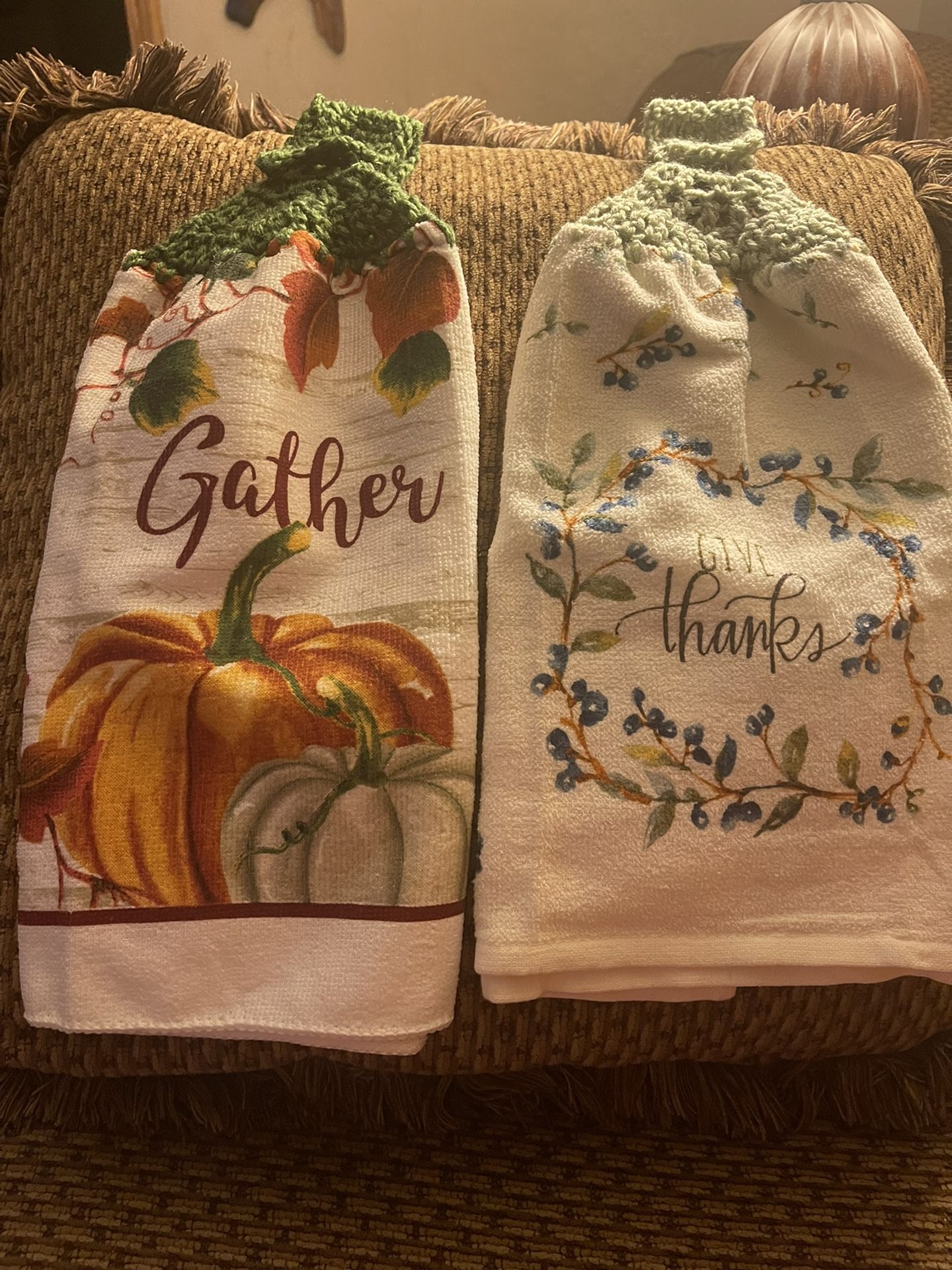 Handmade thanksgiving towels on full towel makes nice deco or gift can hang on oven door or kitchen cabinets smoke free home $6 each