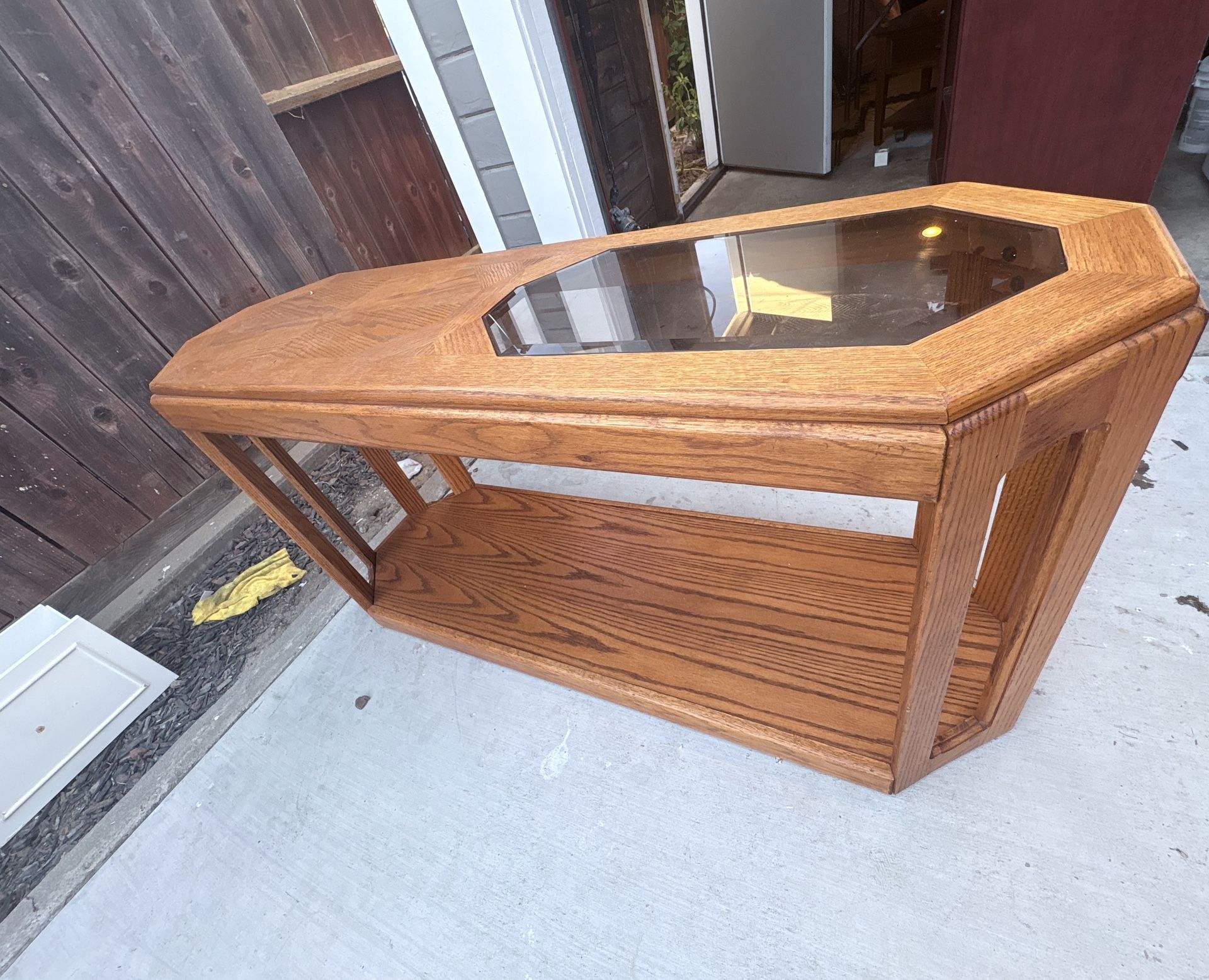 Beautiful vintage oak wood table with smoked glass inlay. Great condition with no cracks, chips, or major scratches. Perfect as a hallway table, entryway accent, or under a mirror. Very sturdy, clean, and stylish.