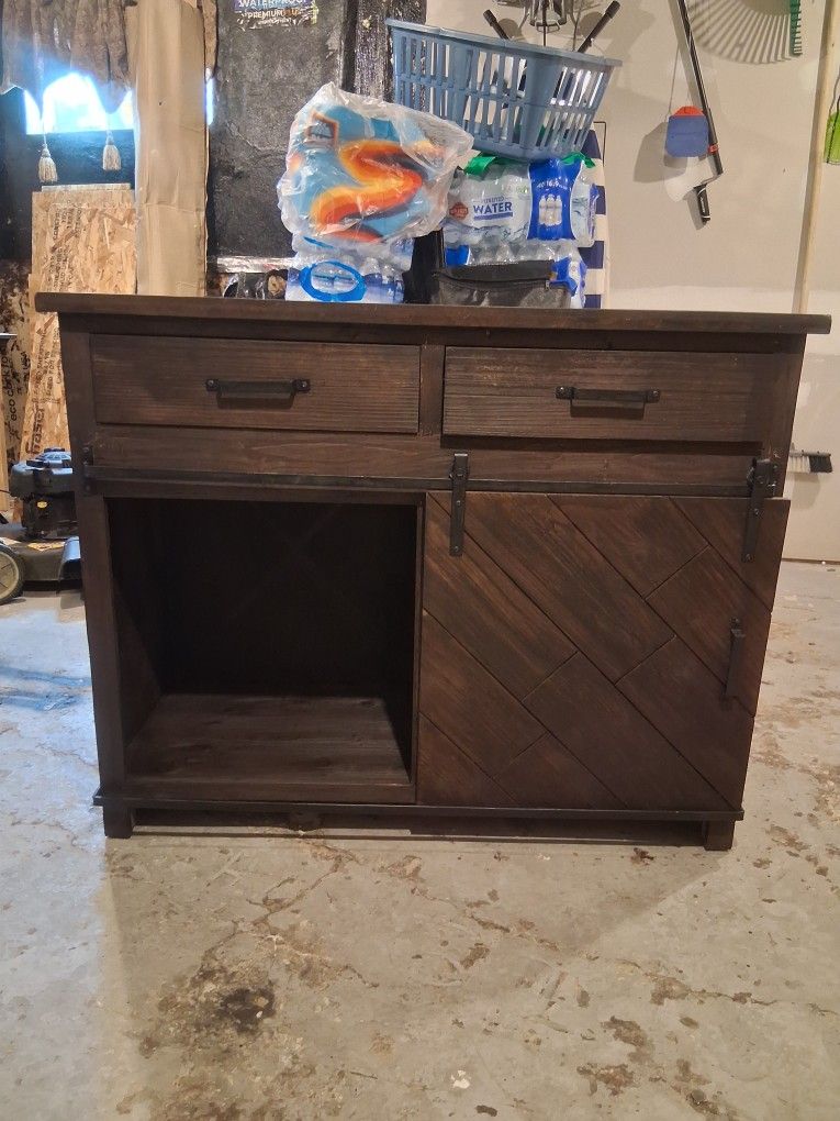 Sturdy wooden cabinet with 2 drawers and barn sliding door 39 wide 16 long
